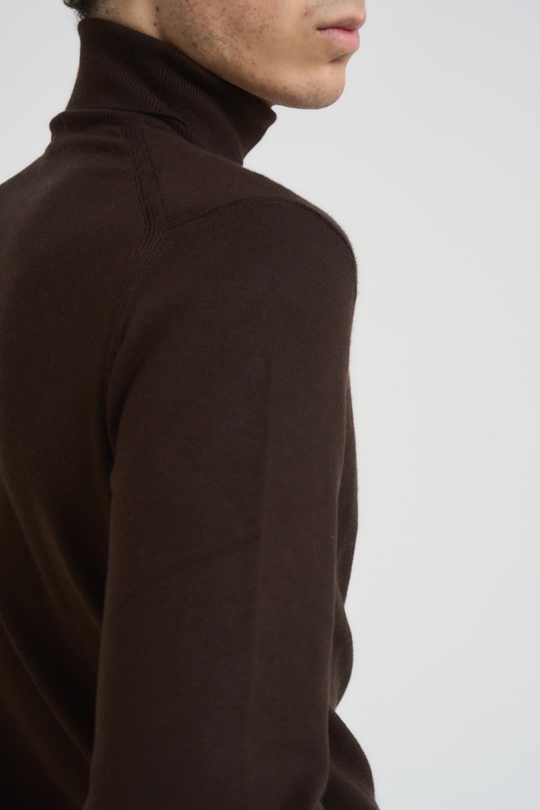 DIKTAT Dolcevita uomo moro. Modello slim fit a collo alto, dettagli a costine. Composizione: 40% viscosa, 30% poliammide, 25% acrilico, 5% cashmere. Il modello è alto 190cm e indossa la taglia L.