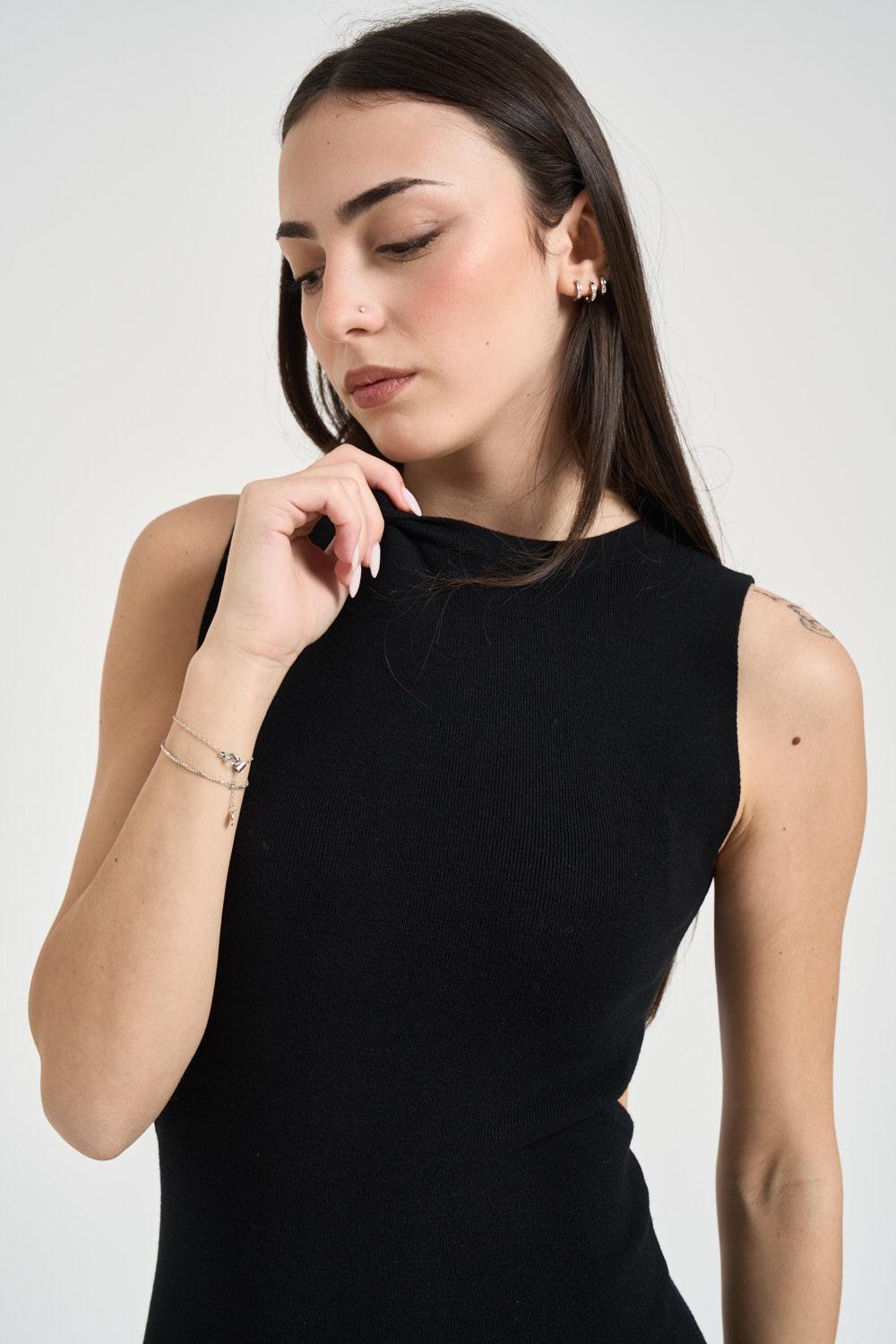 KONTATTO Abito donna aderente nero. Modello lungo in maglia, smanicato. Dettaglio cut-out. Composzione: 72% viscosa, 28% poliestere. La modella è alta 172 cm e indossa la taglia UNI.