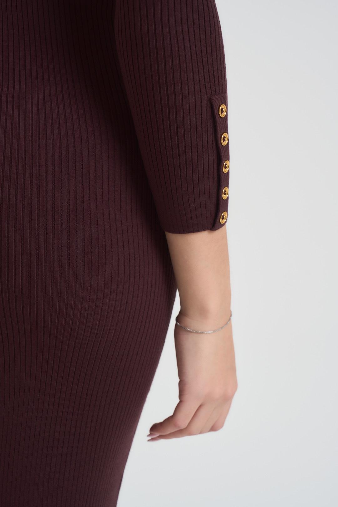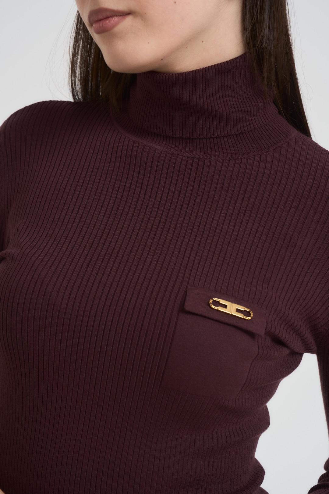 ELISABETTA FRANCHI Abito donna collo alto bordeaux. Modello aderente. Taschino sul petto in raso con dettaglio logo. Manica a tre quarti con bottoni. Gonna longuette con profondo spacco laterale. Lavorazione a costine. Composizione: 64% Lyocell, 20% Poliammide, 16% Seta. La modella è alta 172 cm e indossa la taglia 40.