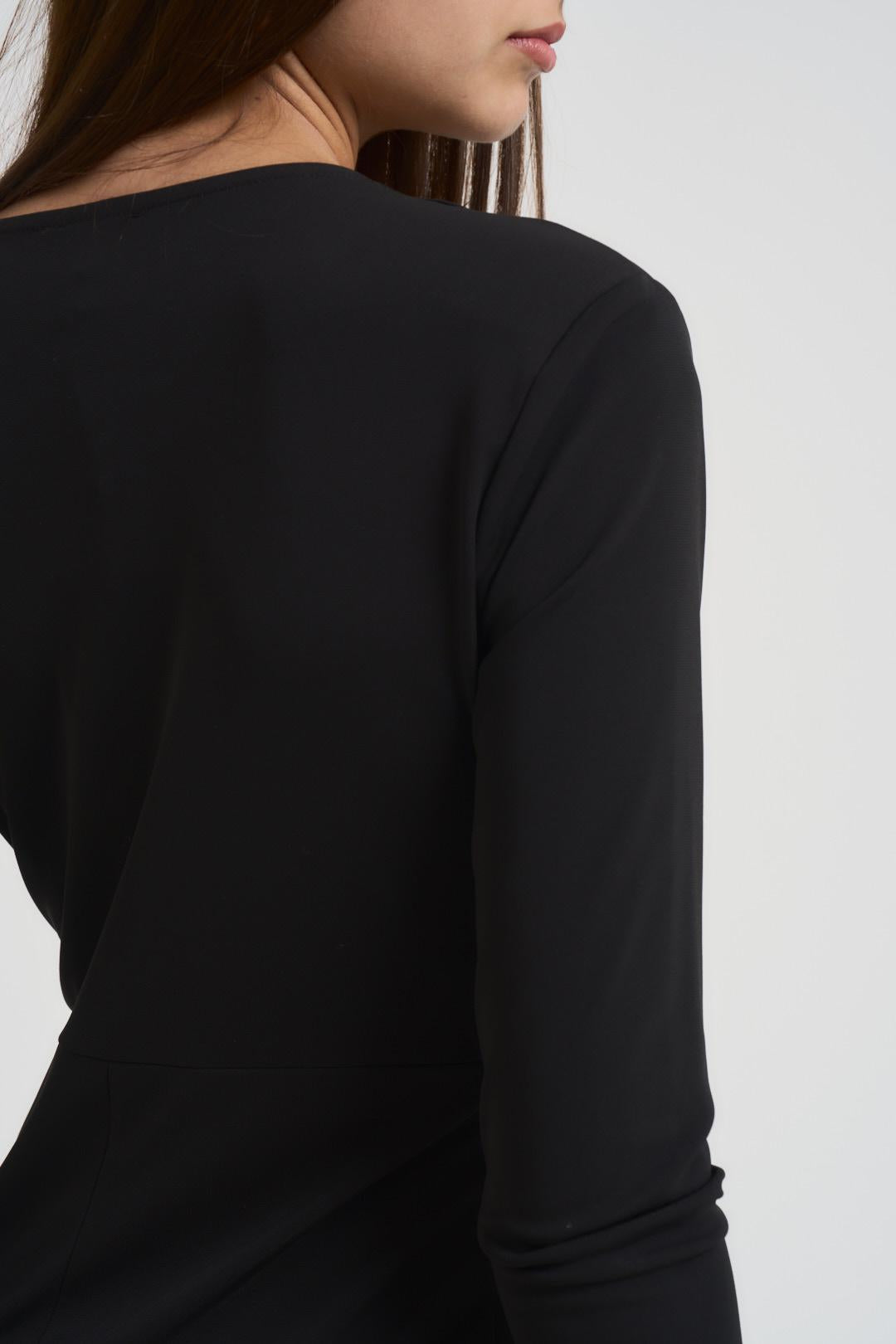 SUSY MIX Abito donna con nodo nero. Modello drappeggiato con scollo a V e gioiello oro centrale. Manica lunga. Composizione: 95% Poliestere, 5% Elastane. La modella è alta 176 cm e indossa la taglia S.