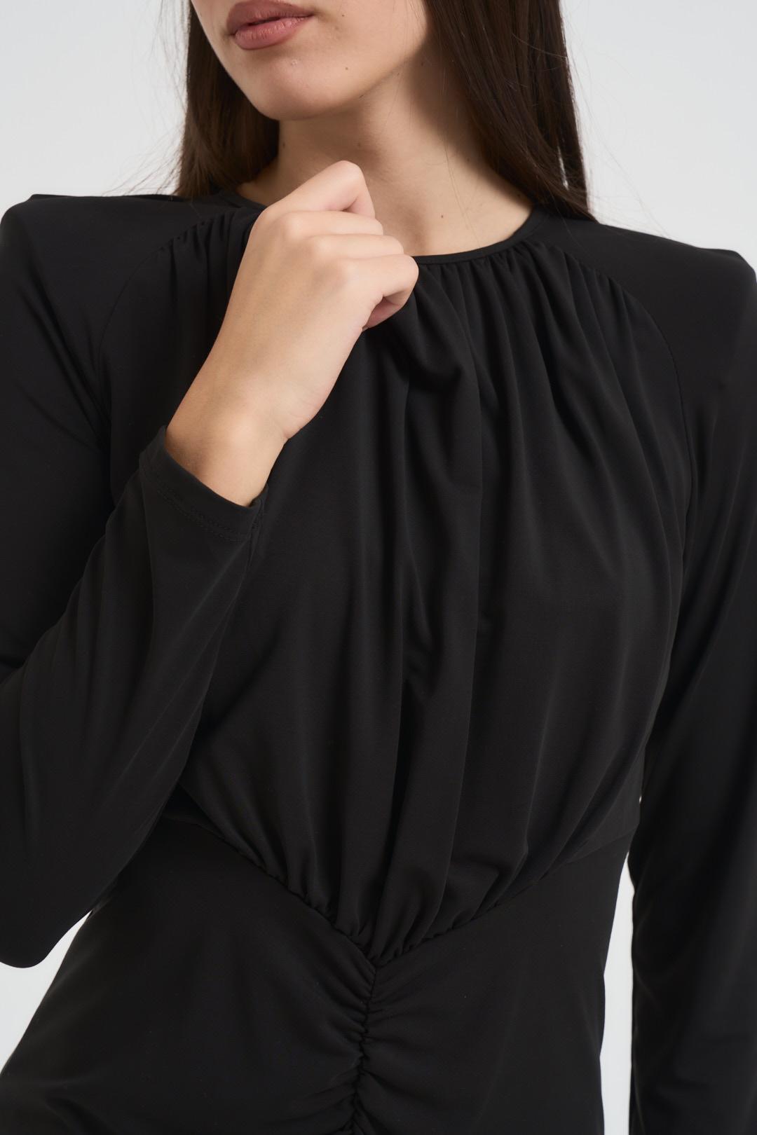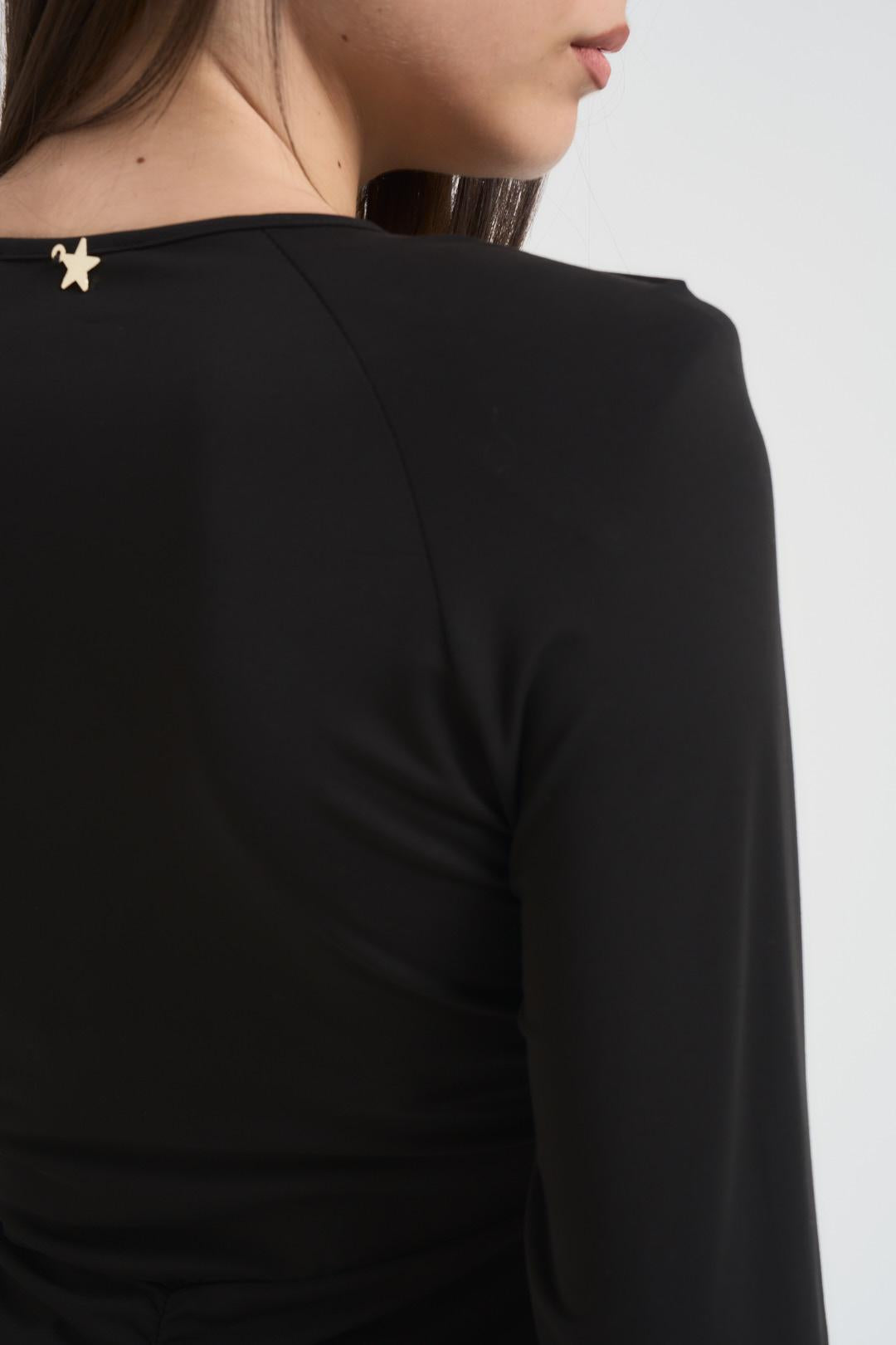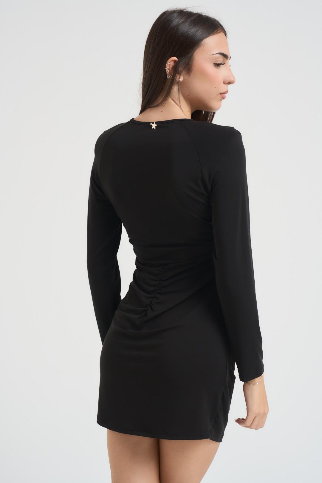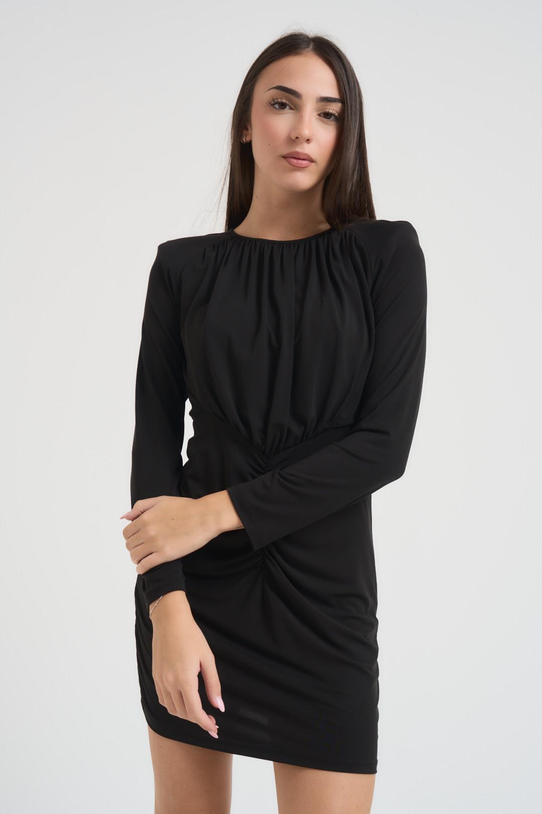 SOUVENIR CLUBBING Abito donna girocollo nero. Modello a manica lunga con lunghezza sopra le ginocchia. Cuciture sul punto vita per effetto drappeggiato. Vestibilità aderente. La modella è alta 172 cm e indossa la taglia S.
