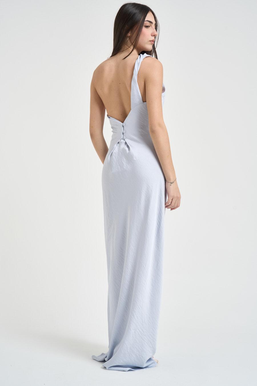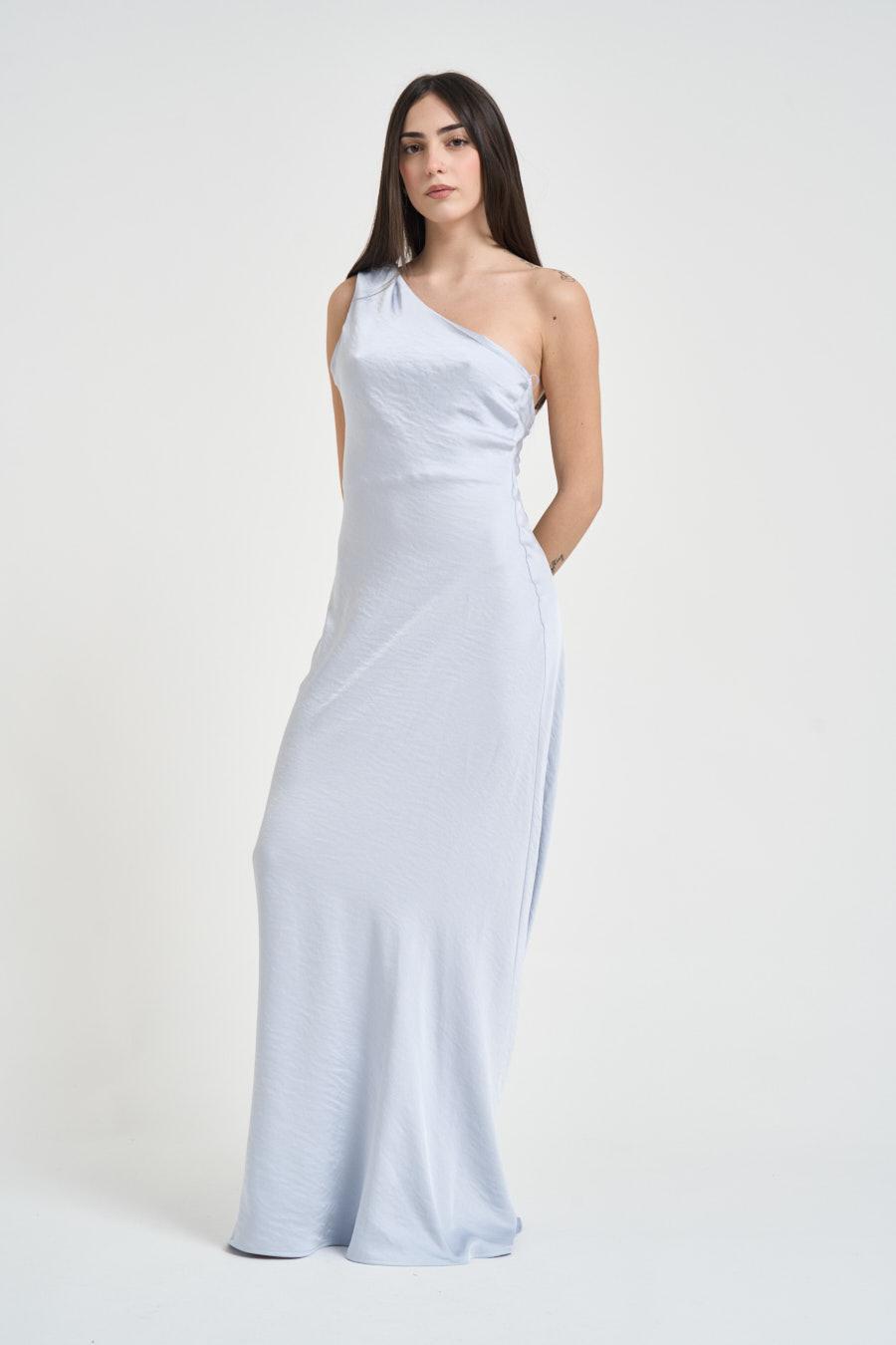ELEH Abito donna lungo celeste chiaro. Modello lungo con monospalla, linea fluida e vestibilità morbida. Spalla arricciata, scollo asimmetrico e schiena scoperta con chiusura a bottoni. Tessuto dalla finitura leggermente satinata. Composizione: 100% poliestere. La modella è alta 172cm e indossa la taglia 40.