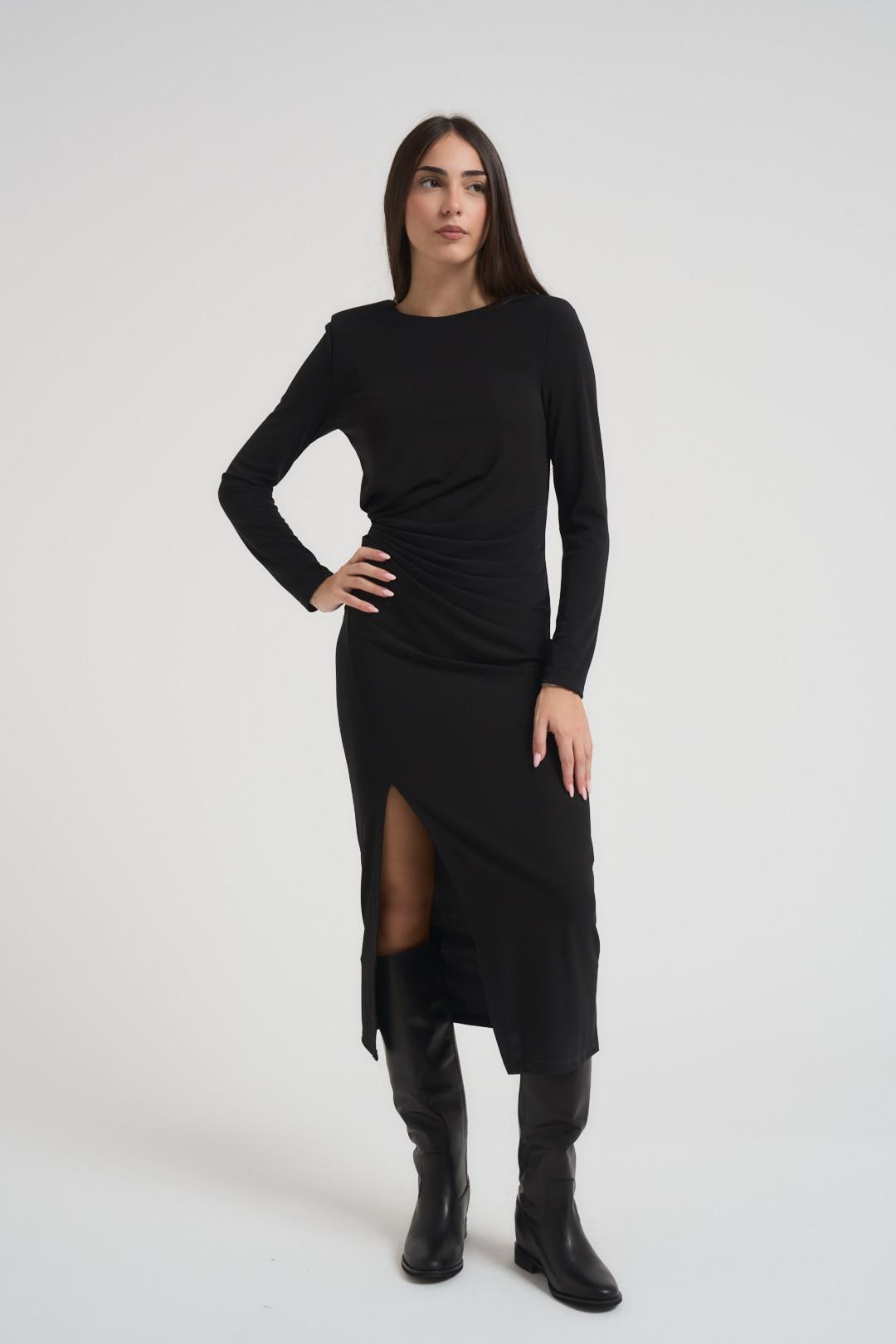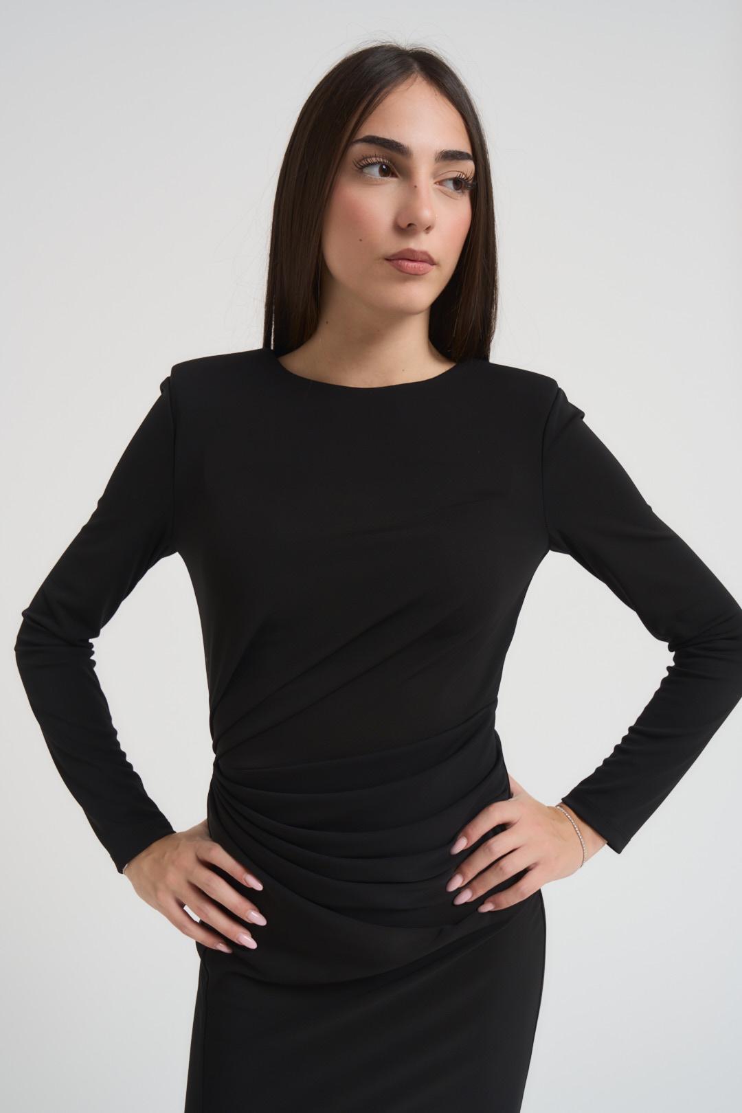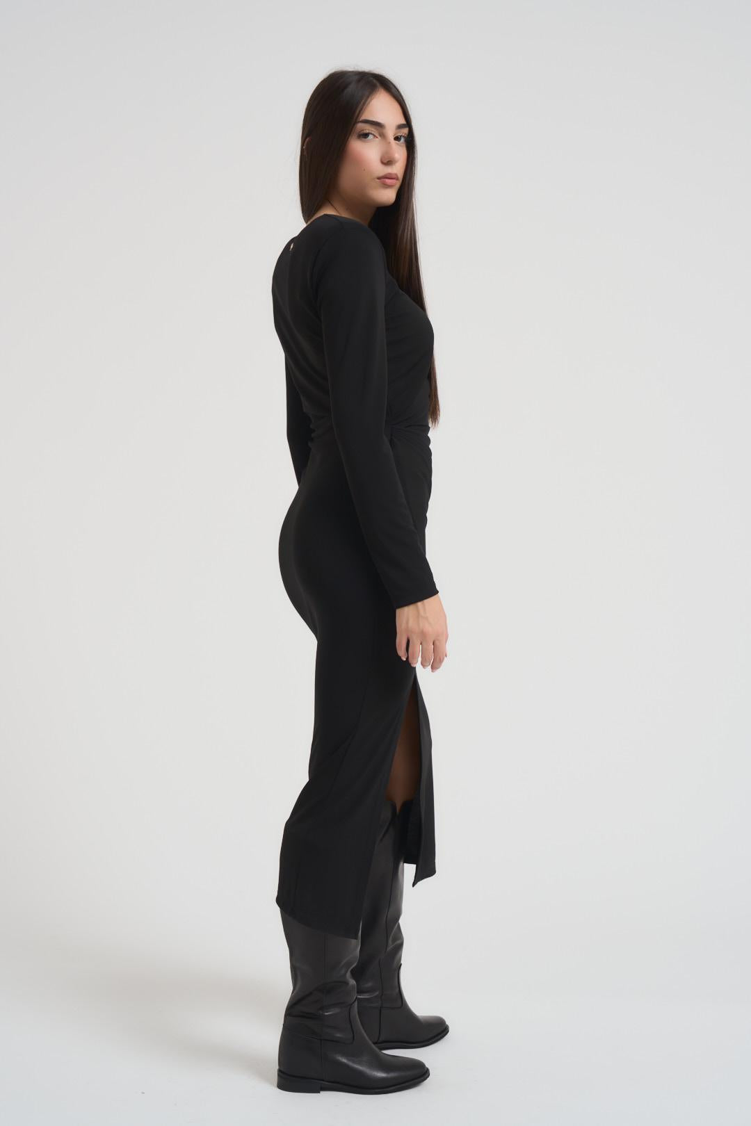 PHILIA Abito donna lungo con spacco nero. Modello girocollo, spalline imbottite, arricciatura sul lato. Fit slim. Composizione: 100% poliestere. La modella è alta 172 cm e indossa la taglia S.