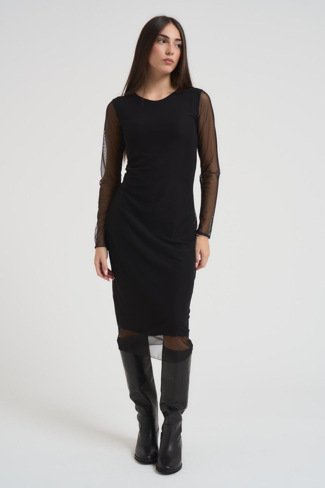 SUSY MIX Abito donna midi in tulle nero. Modello elasticizzato girocollo con manica lunga in tulle. Fodera interna. Composizione: 95% cotone 5% elastan. La modella è alta 172 cm e indossa la taglia unica.