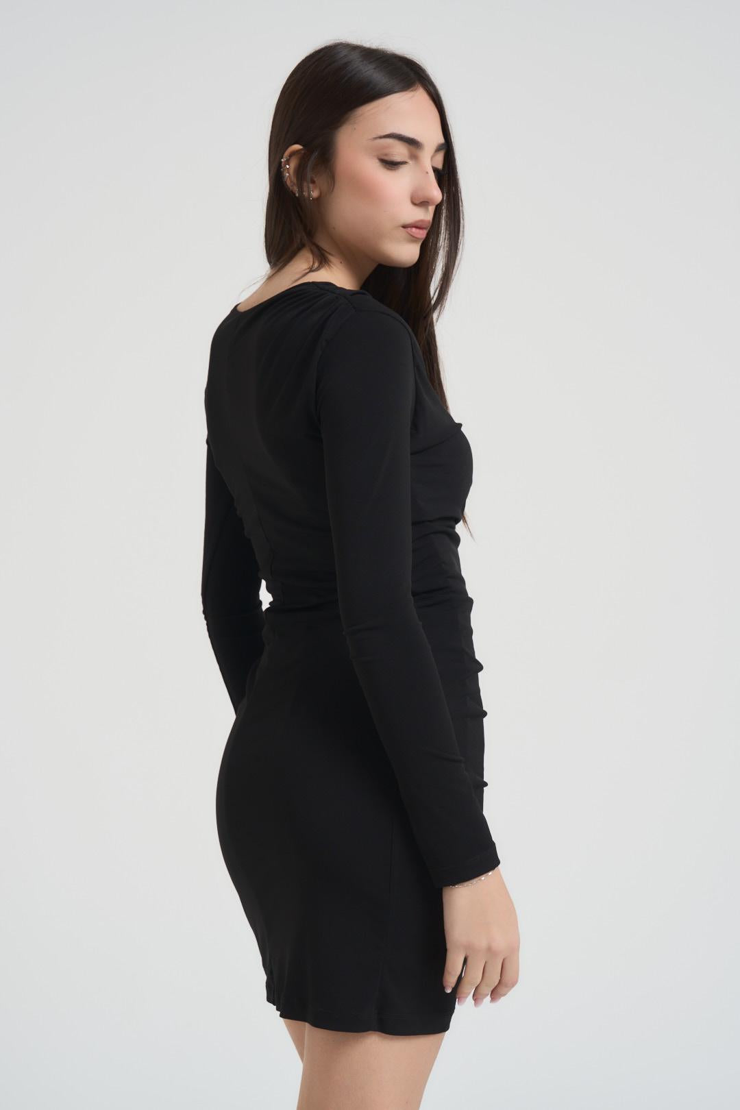 KIKISIX Abito donna mini nero. Modello slim fit con manica lunga e girocollo. Leggero drappeggio sul davanti. Composizione: 95% poliestere 5%elastane. La modella è alta 172 cm e indossa la taglia S/M.