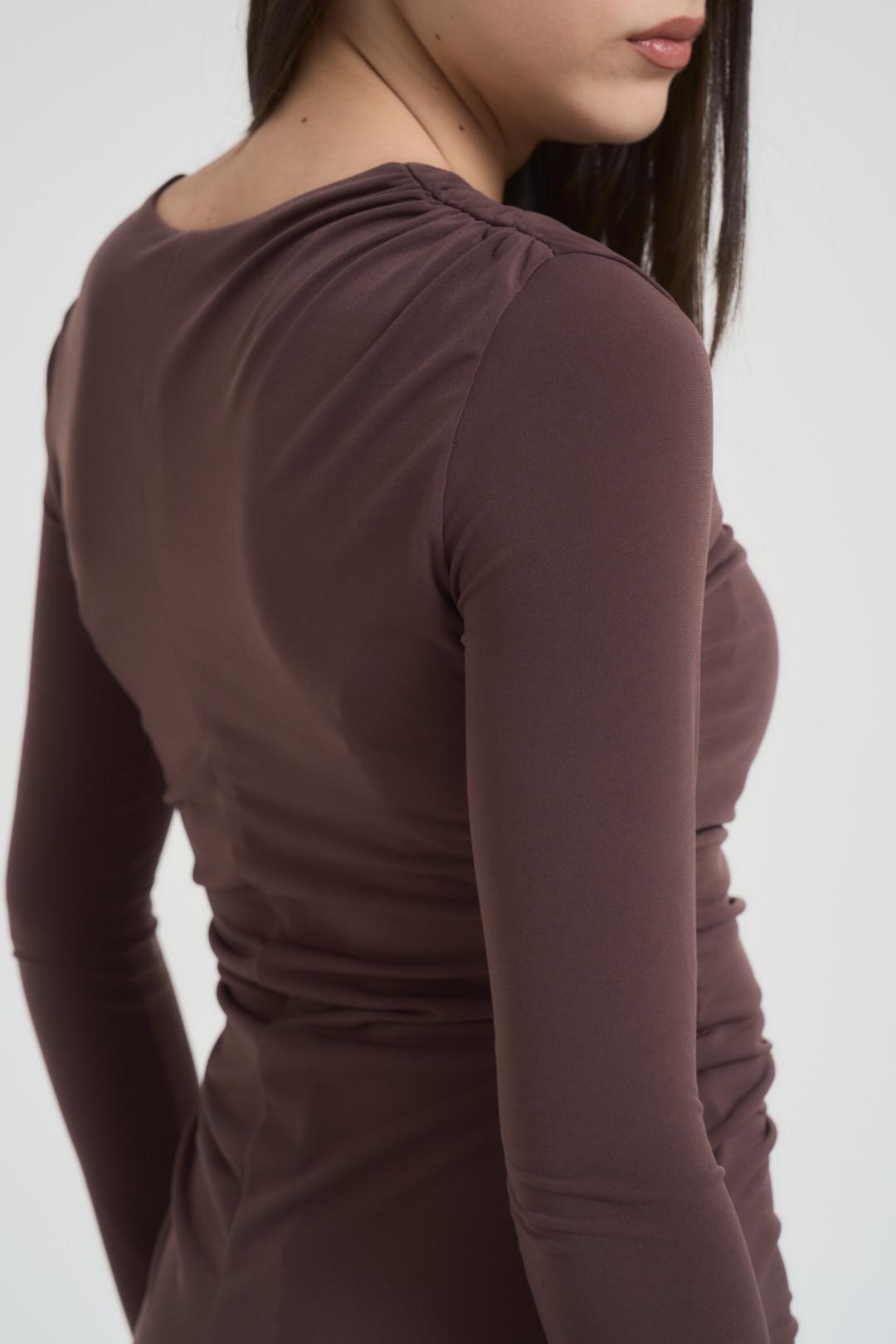 KIKISIX Abito donna mini tortora. Modello slim fit con manica lunga e girocollo. Leggero drappeggio sul davanti. Composizione: 95% poliestere 5%elastane. La modella è alta 172 cm e indossa la taglia S/M.