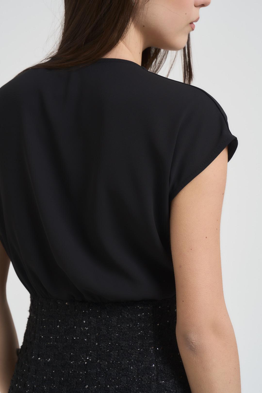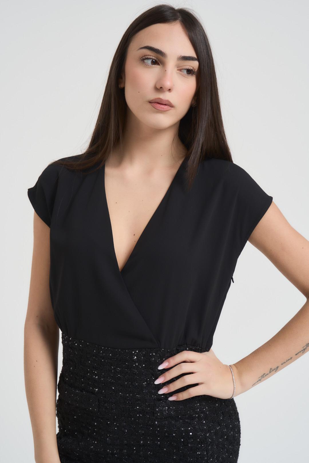 VICOLO Abito donna nero con dettaglio lurex. Modello composto da blusa a scollo a v e amnica corta chiffon e minigonna con trama e lurex. Composizione: poliestere. La modella è alta 172 cm e indossa la taglia S.