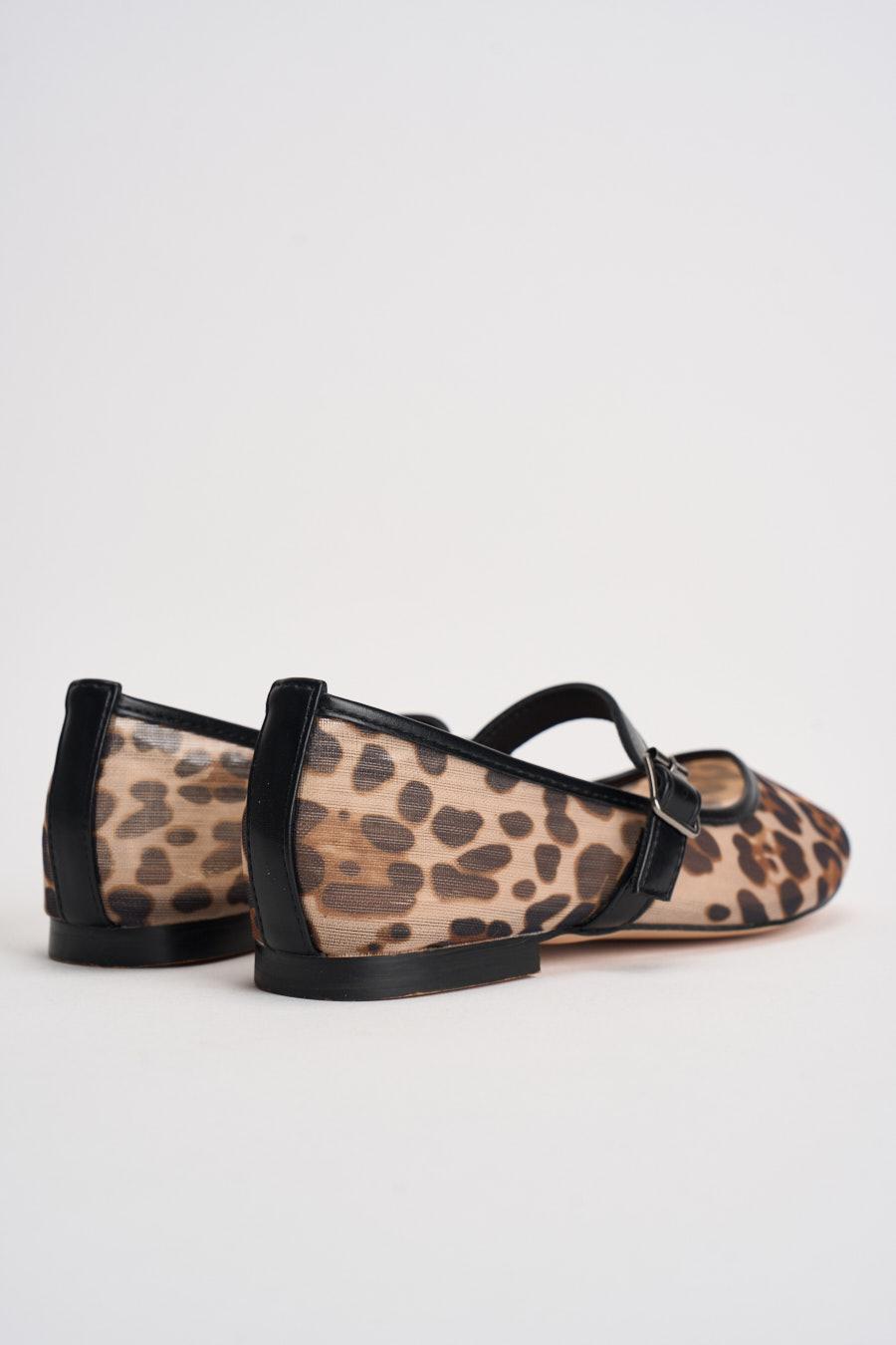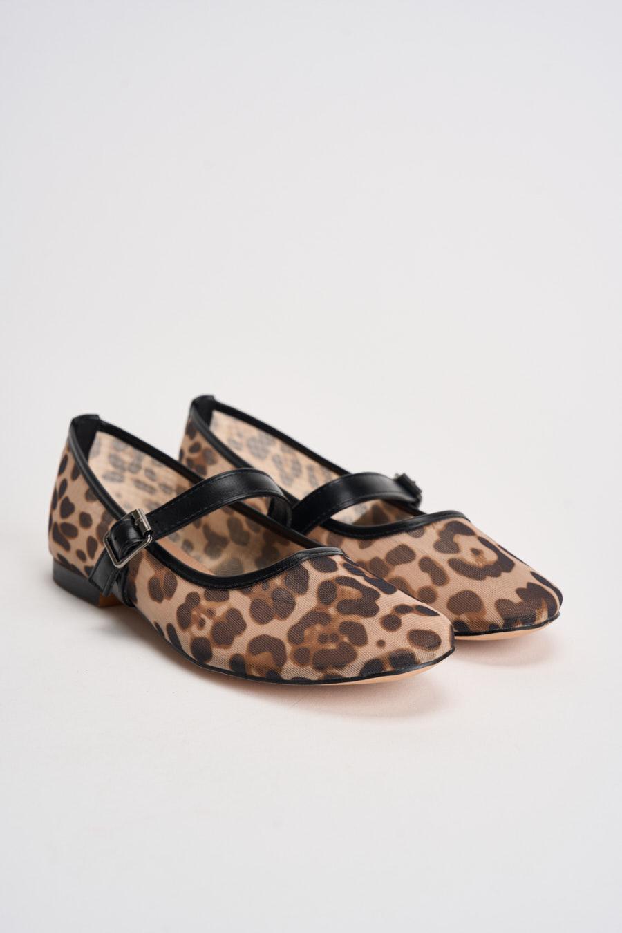CAFFÈ NERO Ballerina donna animalier. Modello flat con punta affusolata e tomaia in tessuto con stampa leopardata dai toni naturali. Cinturino sul collo del piede con fibbia regolabile in metallo e profili a contrasto in materiale effetto pelle. Suola bassa e sottile. Altezza tacco: 1 cm.