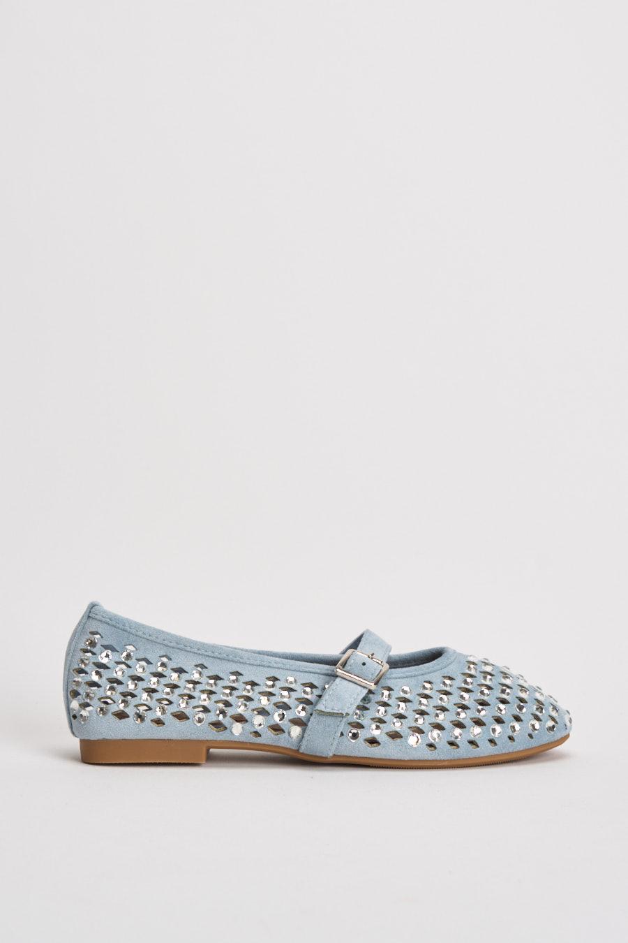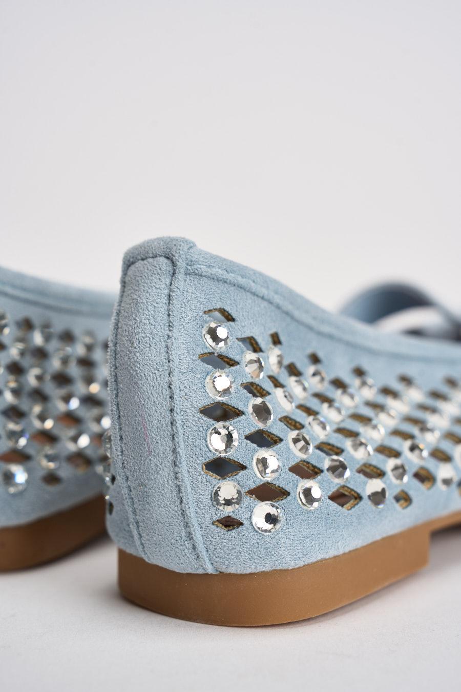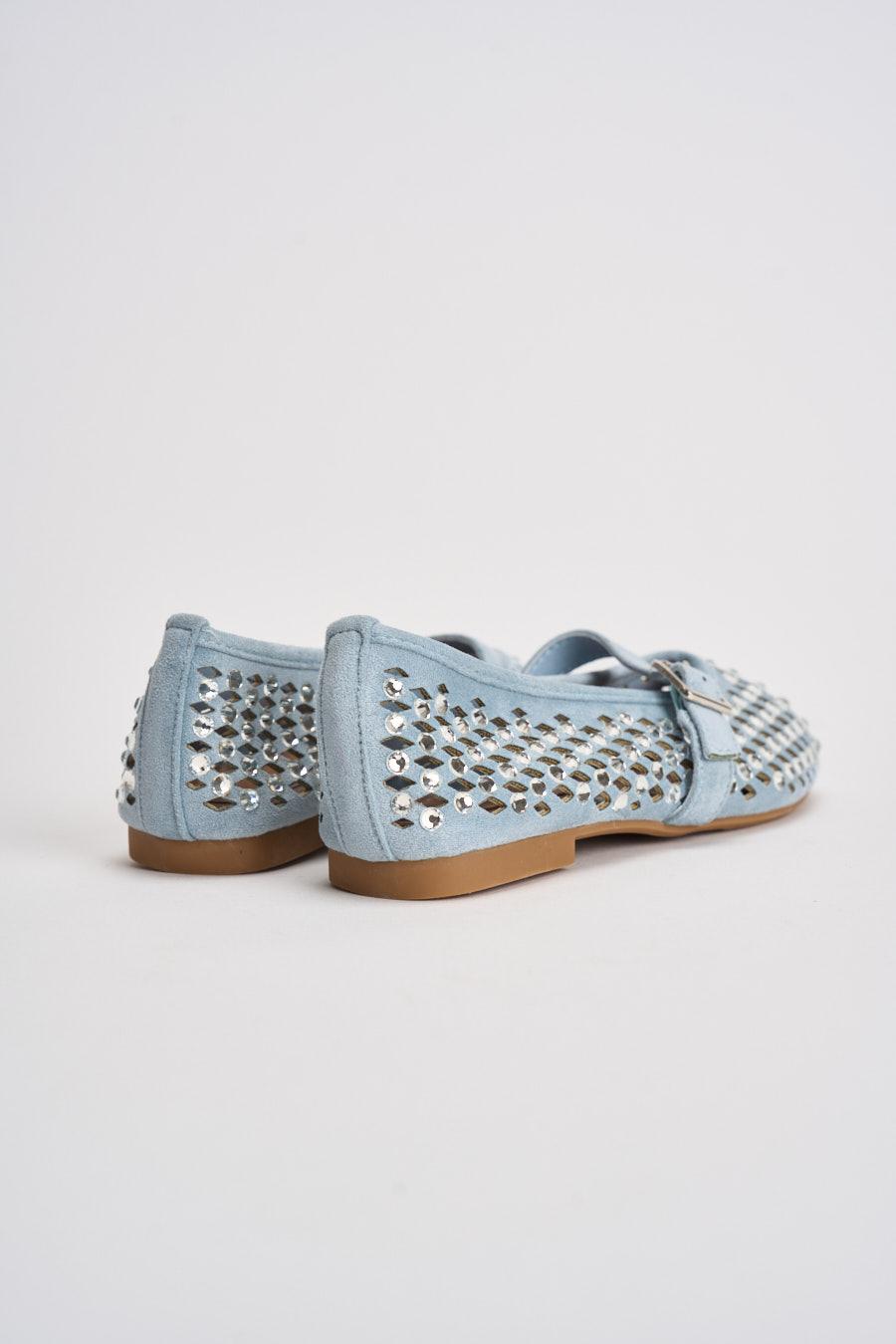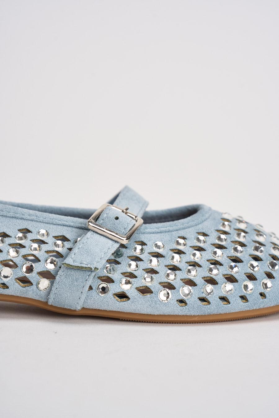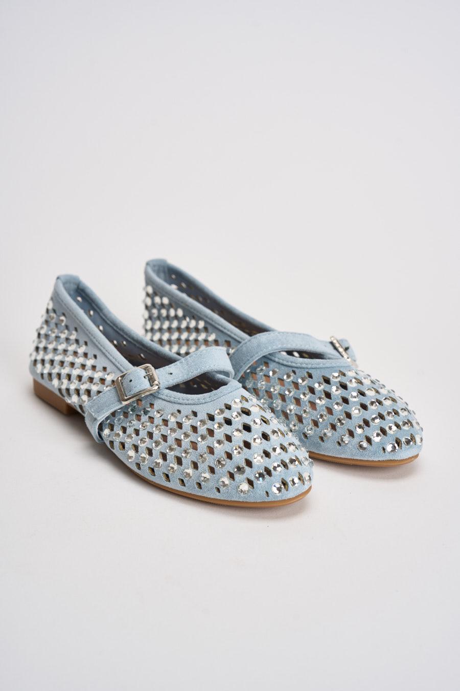 SUSY MIX Ballerina donna con strass azzurra. Modello con punta arrotondata e cinturino sul collo del piede con fibbia metallica regolabile. La tomaia è arricchita da una lavorazione traforata impreziosita da applicazioni di strass. Suola sottile che garantisce comfort e leggerezza durante la camminata. Composizione: tomaia in pelle scamosciata. Suola in gomma. Calzata regolare.