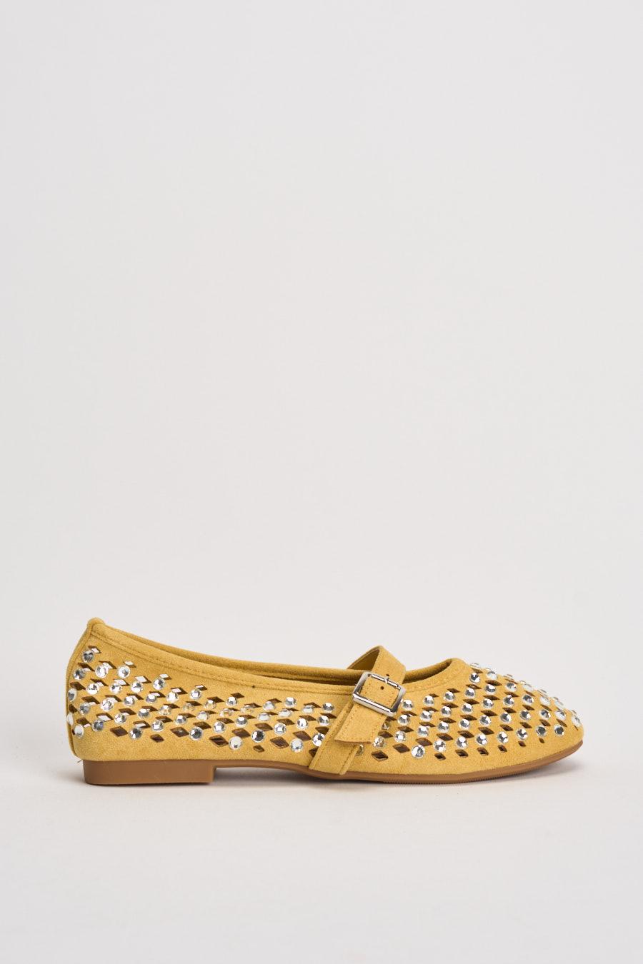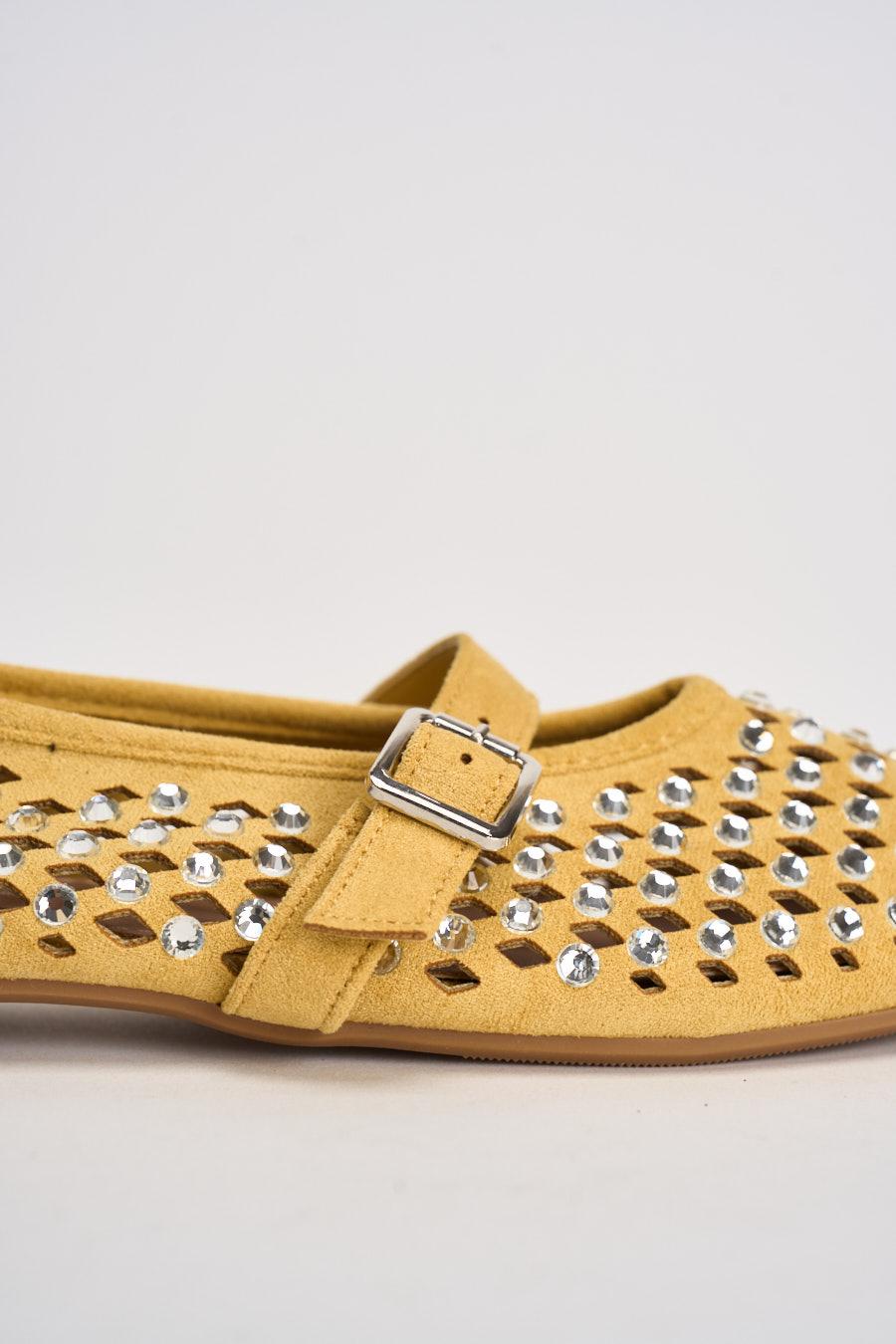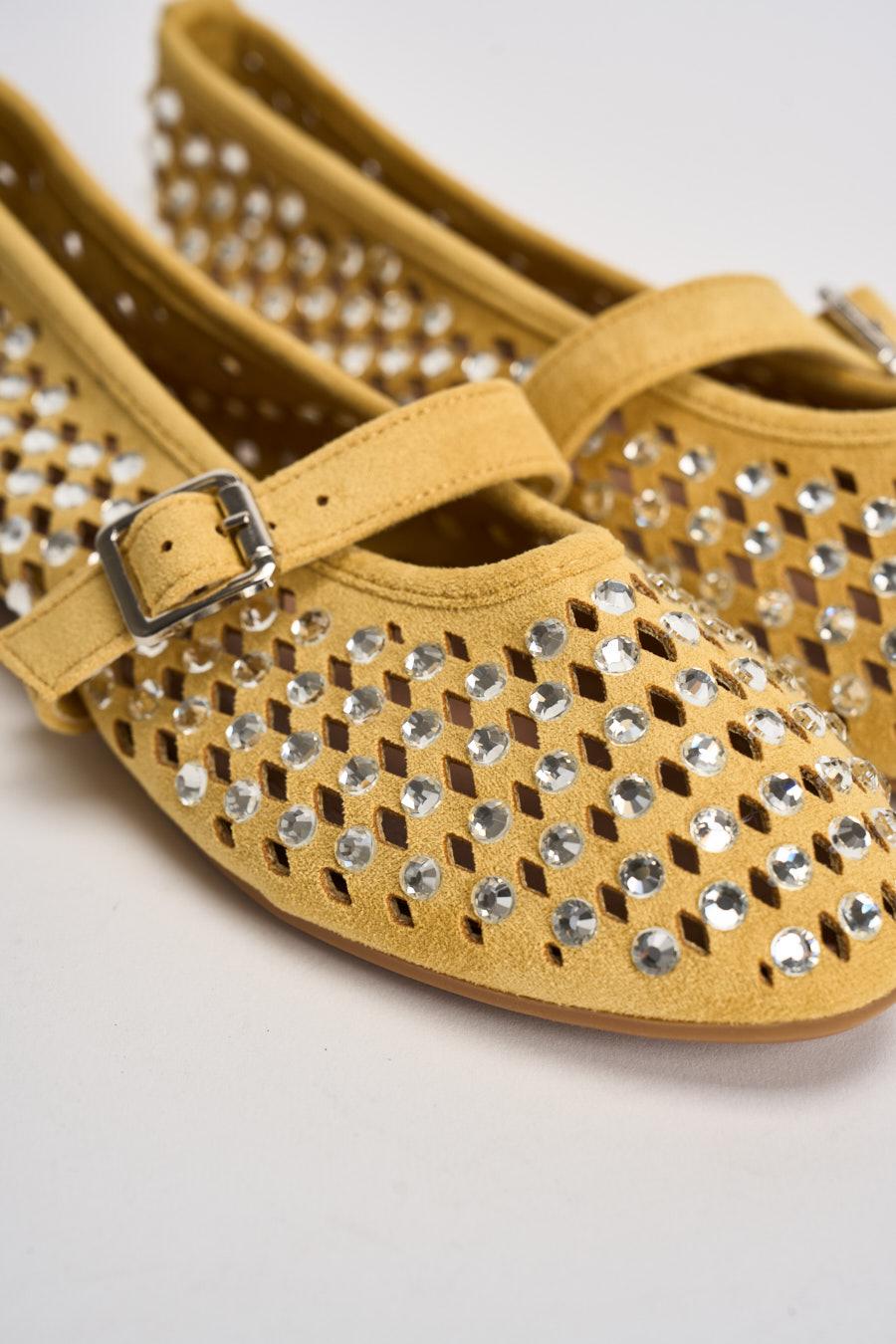 SUSY MIX Ballerina donna con strass gialla. Modello con punta arrotondata e cinturino sul collo del piede con fibbia metallica regolabile. La tomaia è arricchita da una lavorazione traforata impreziosita da applicazioni di strass. Suola sottile che garantisce comfort e leggerezza durante la camminata. Composizione: tomaia in pelle scamosciata. Suola in gomma. Calzata regolare.