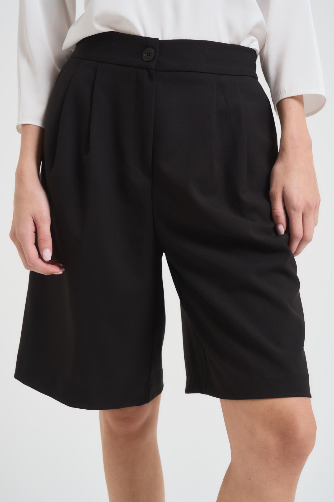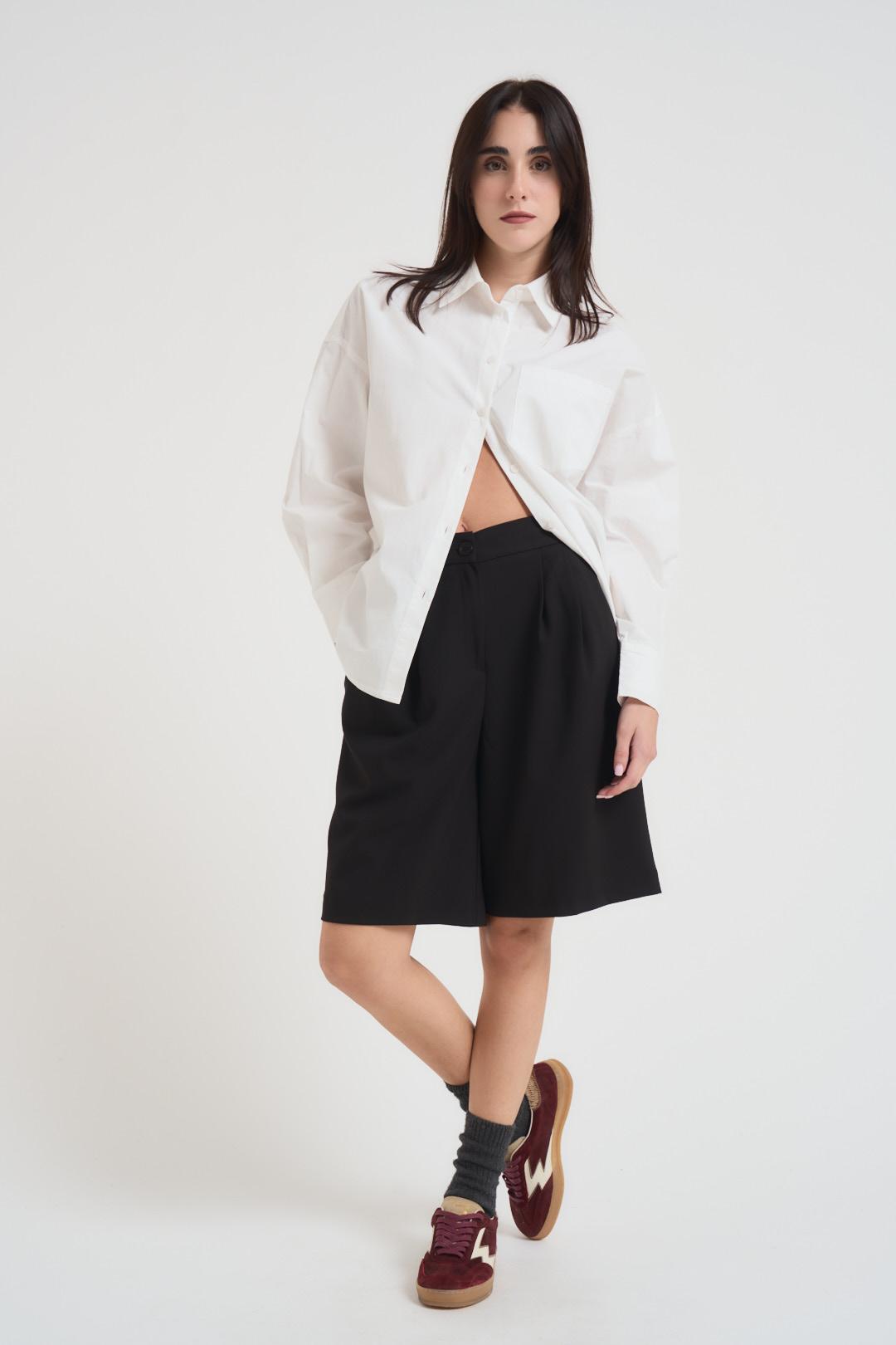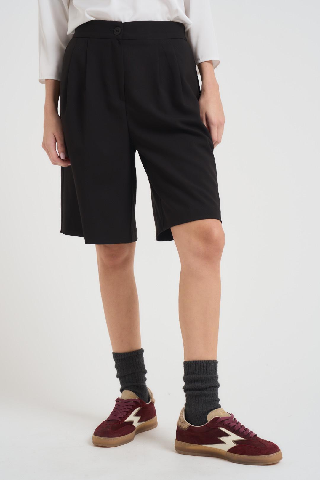 IMPERIAL Bermuda donna over nero. Modello a vita media e gamba larga, passanti per cintura, tasche laterali e chiusura anteriore con bottone. Composizione 100% tencel. La modella è alta 175cm e indossa la taglia S.