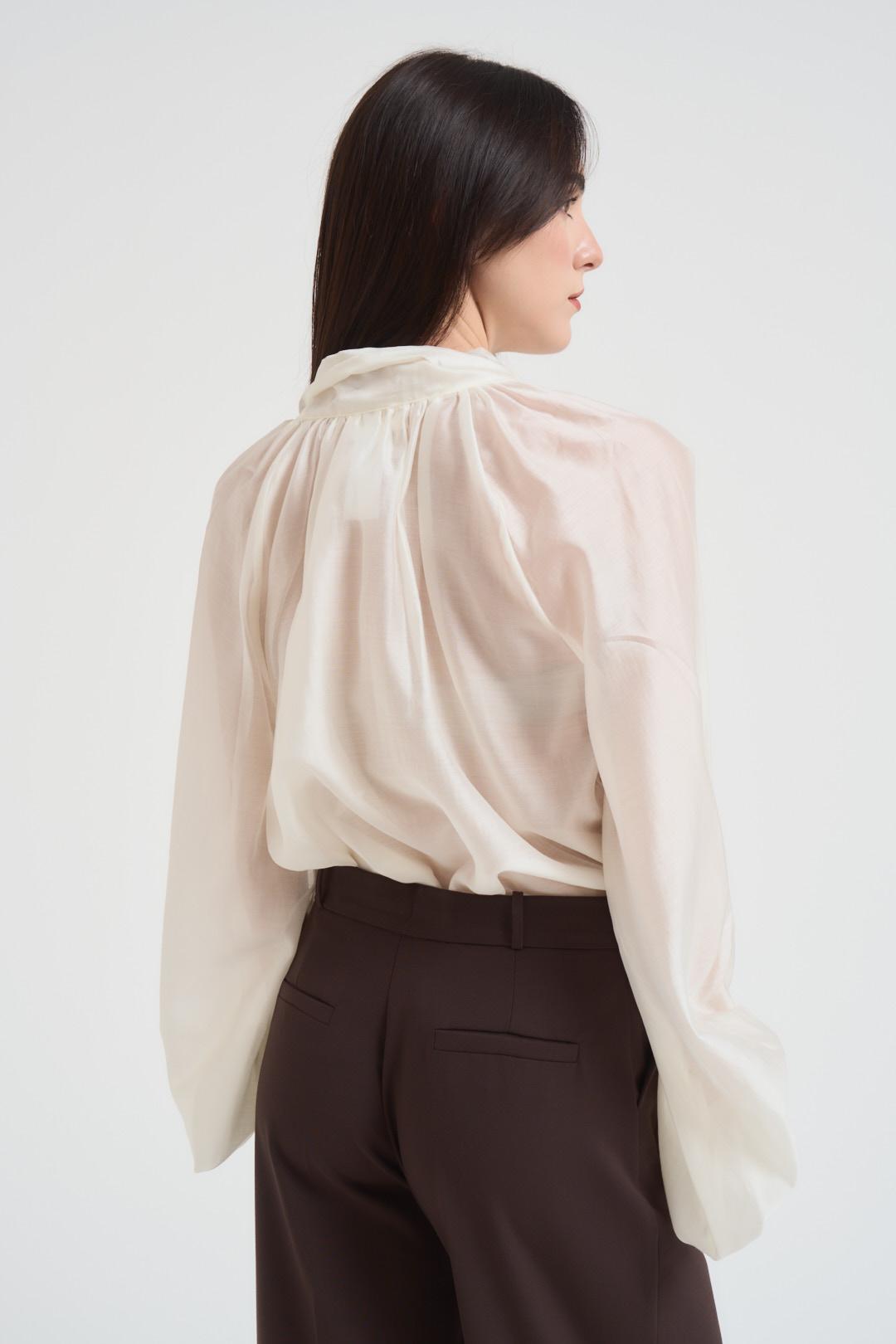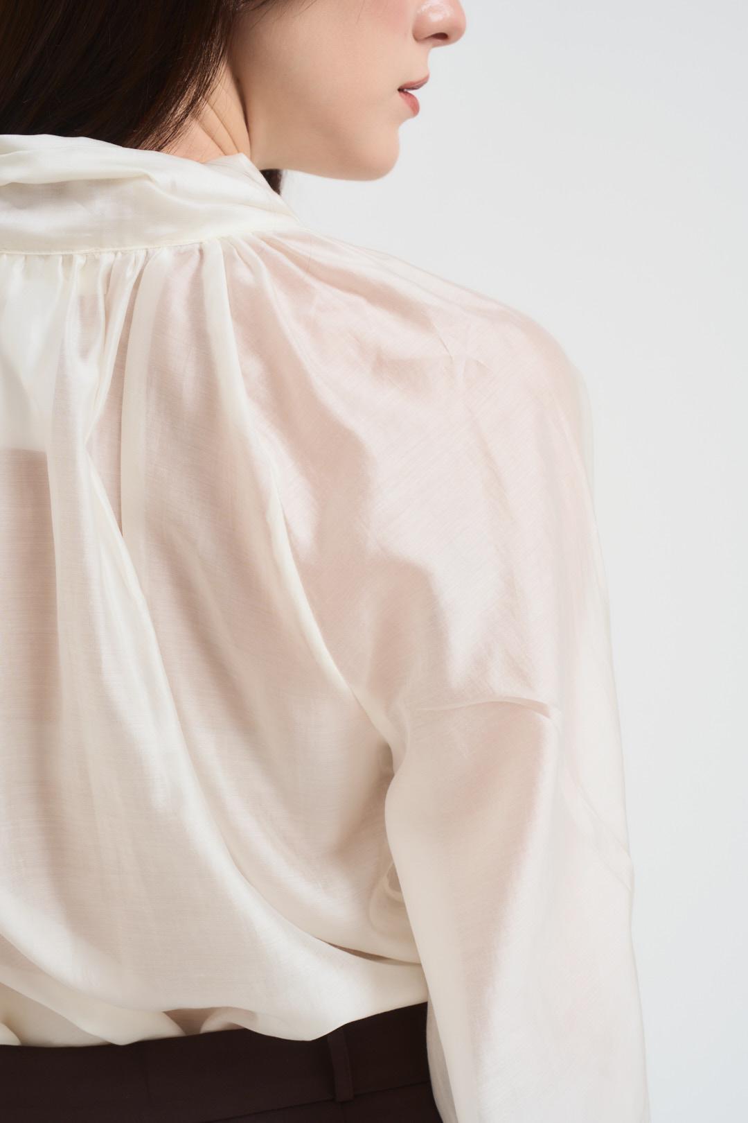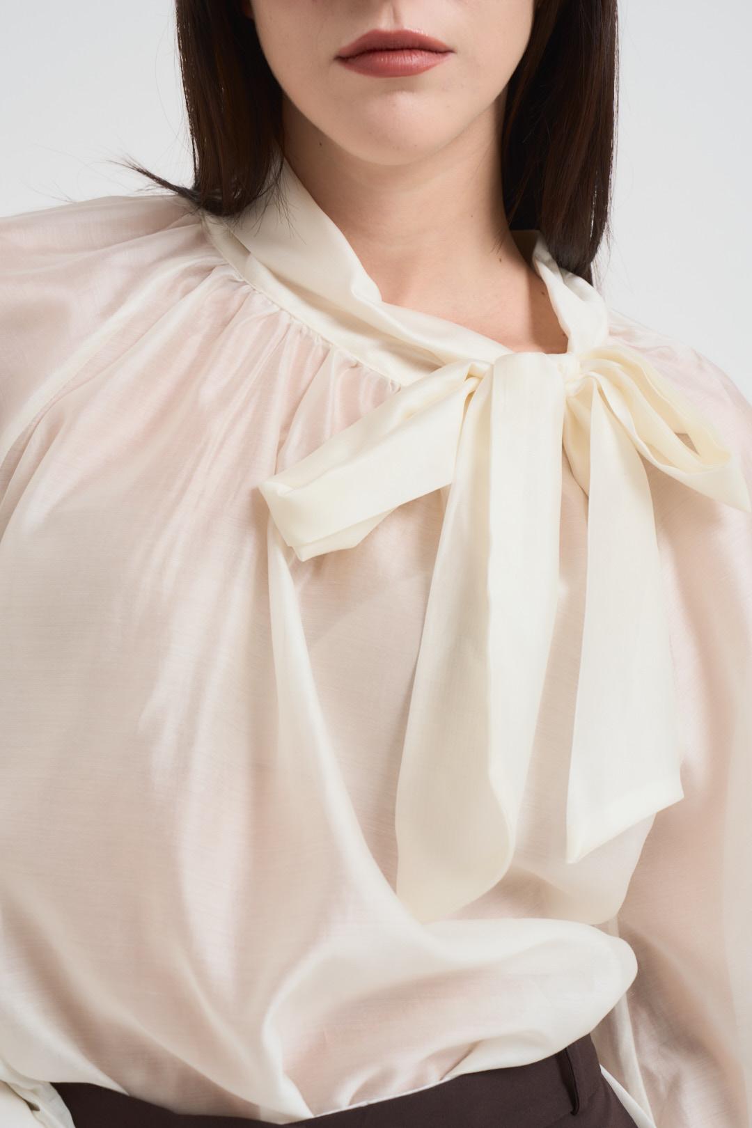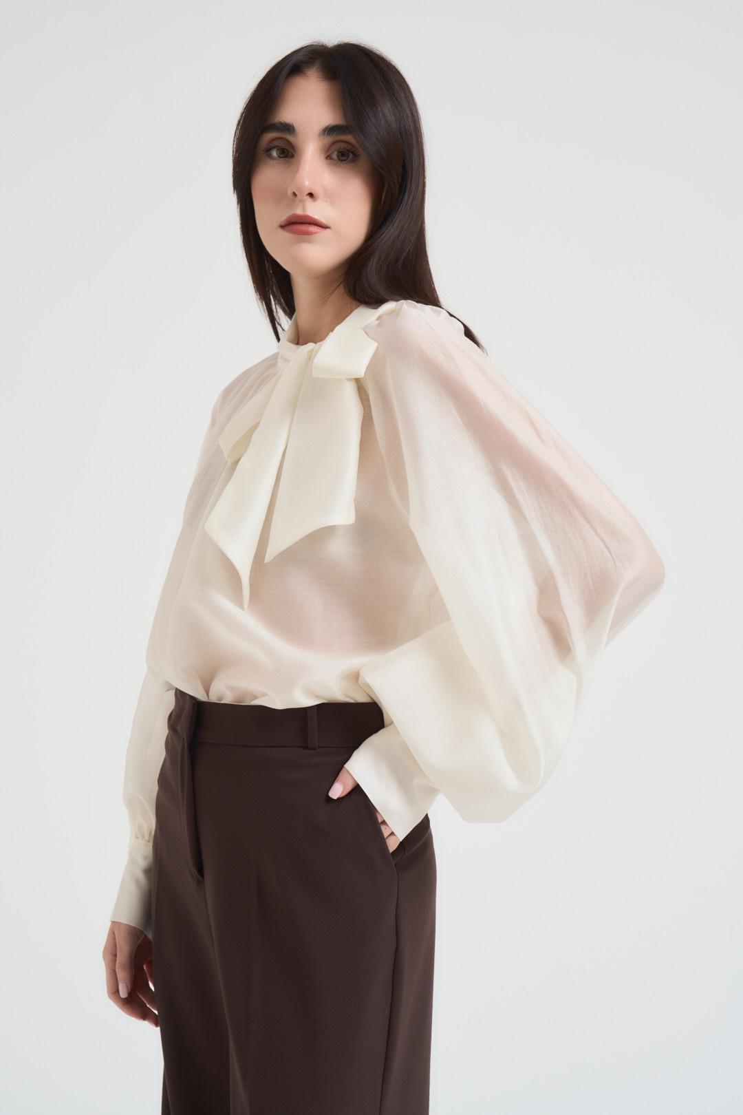 VICOLO Blusa donna con fiocco latte. Modello effetto organza con maniche balloon e polsino alto. Composizione: 86% Lyocell 15% Poliestere. La modella è alta 175 cm e indossa la taglia S.