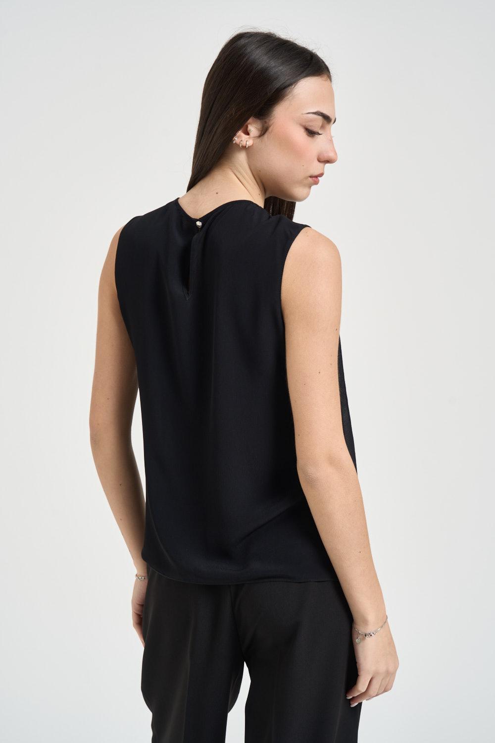 PATRIZIA PEPE Blusa donna con nodo nera. Modello dalla vestibilità regolare, spalla regolare, senza maniche, girocollo, dettaglio effetto nodo davanti e chiusura a goccia sul retro. Composizione: 100% viscosa. La modella è alta 172 cm e indossa la taglia 40.