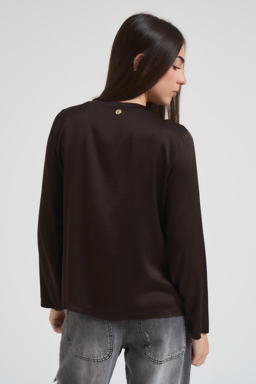 VITTO Blusa donna girocollo satinata marrone. Modello a manica lunga, regular fit. Composizione: 97%viscosa 3% elastane. La modella è alta 172 cm e indossa la taglia S/M.
