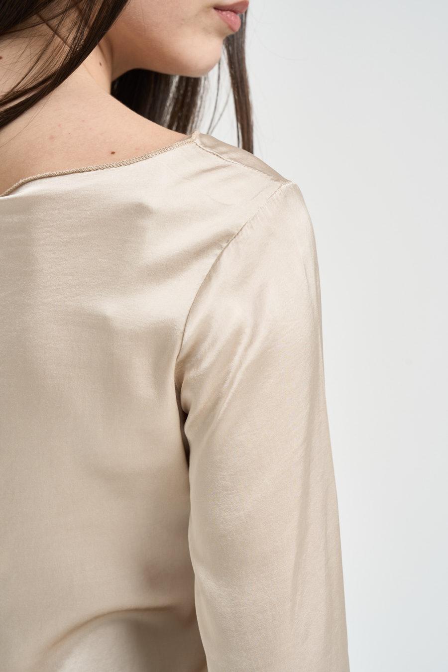 SUSY MIX Blusa donna satinata beige. Modello regular fit. Scollo a barca. Manica lunga. Composizione: 97% viscosa, 3% elastane. La modella è alta 172 cm e indossa la taglia UNI.