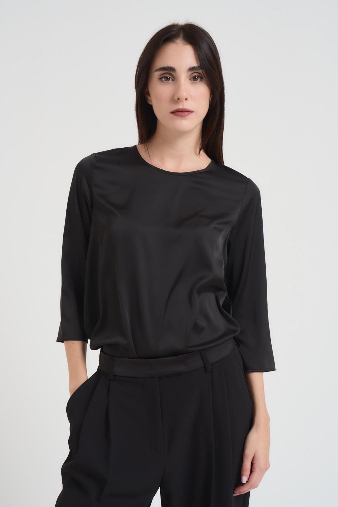 IMPERIAL Blusa donna satinata nera. Modello con scollo a goccia sul retro e con maniche a tre quarti. Regular fit. Composizione: 97% Poliestere 3% Elastan. La modella è alta 175cm e indossa la taglia S.