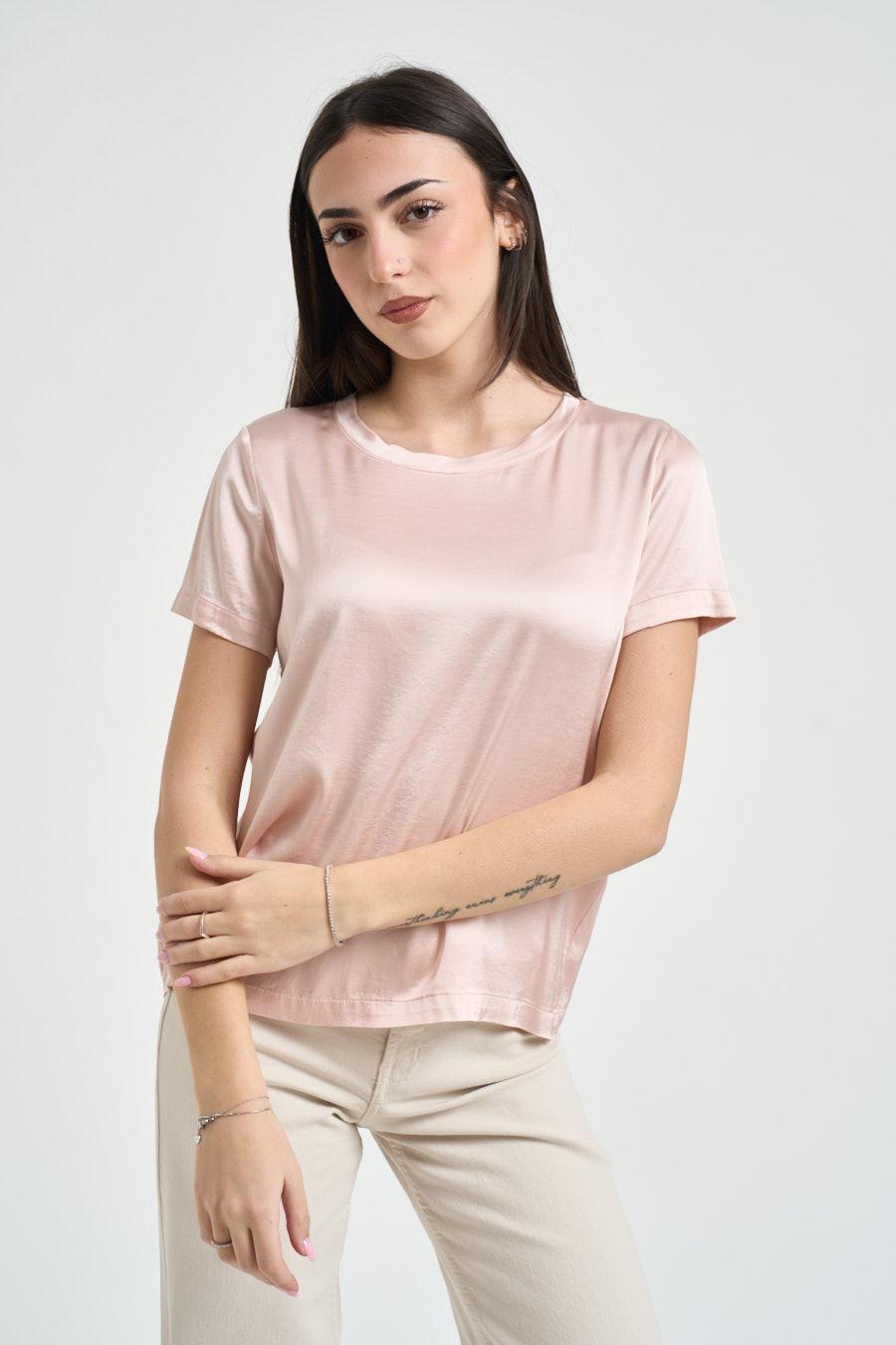 VICOLO Blusa donna satinata rosa. Modello dalla vestibilità morbida. Girocollo. Manica corta. Composizione: 97% viscosa, 3% elastane. La modella è alta 172 cm e indossa la taglia S.