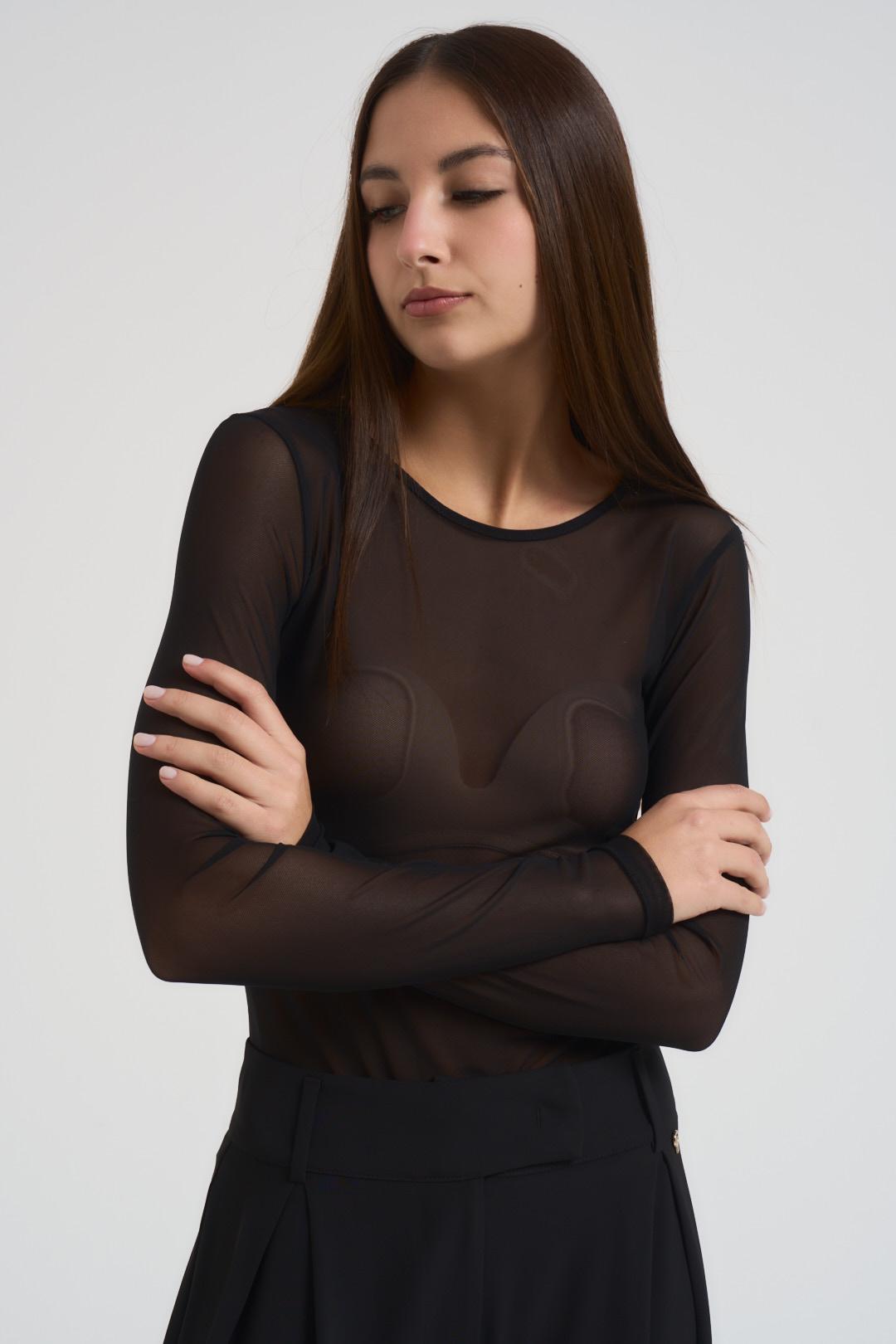 VICOLO Body donna manica lunga semitrasparente nero. Modello girocollo slim fit. Composizione: 94% polaimmide 6%elastane. La modella è alta 176 cm e indossa la taglia S.