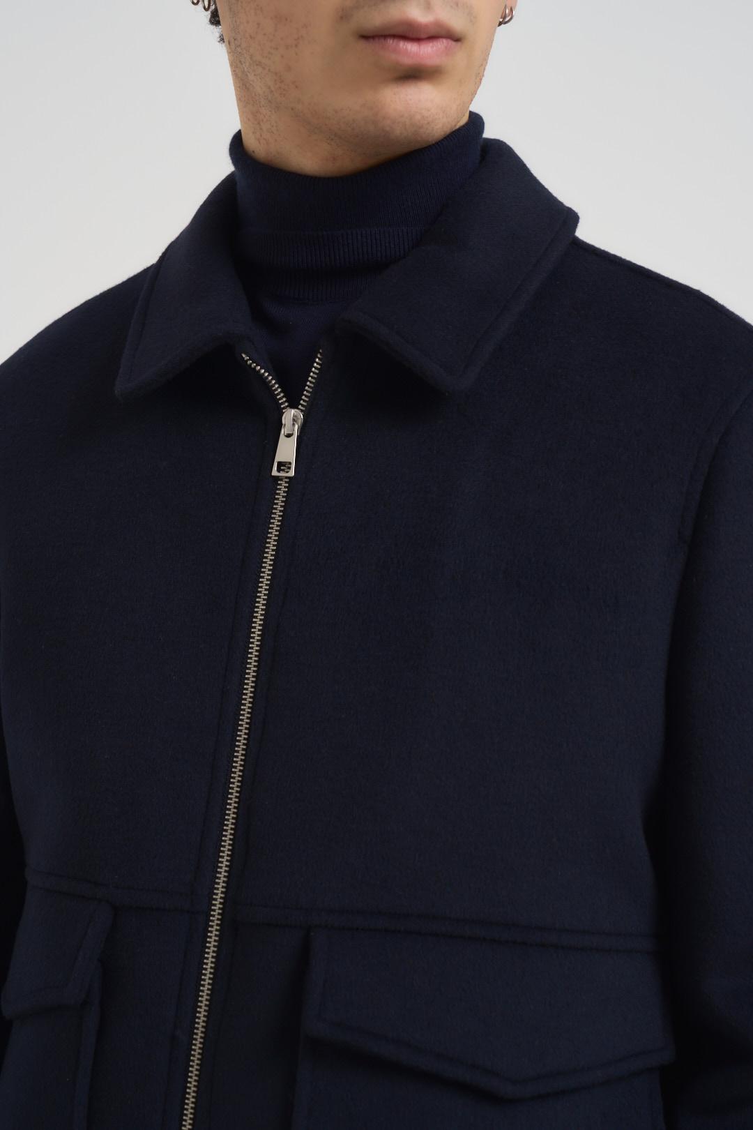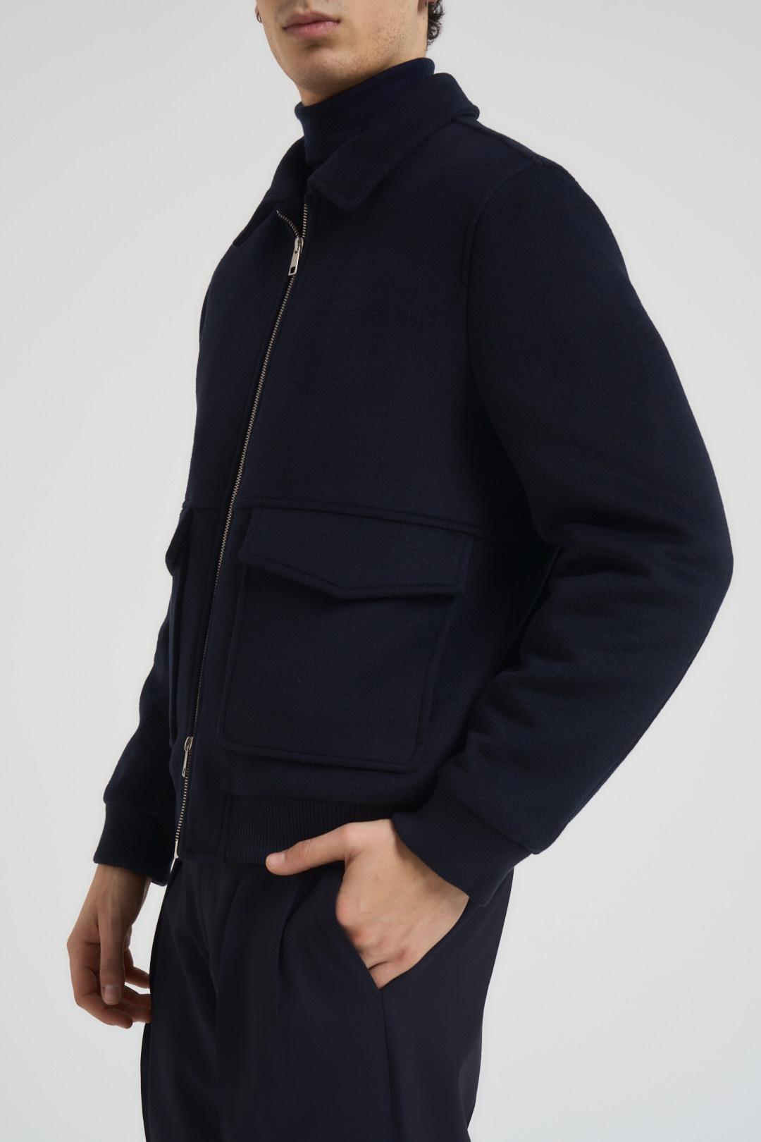 AT.P.CO Bomber uomo blu notte. Modello in lana con colletto a camicia e maniche lunghe. Fondo e polsi in maglia a costine con tasche frontali con patta e chiusura a zip sul davanti. Composizione: 57%lana 33%poliestere 10%seta. Il modello è alto 190cm e indossa la taglia L.