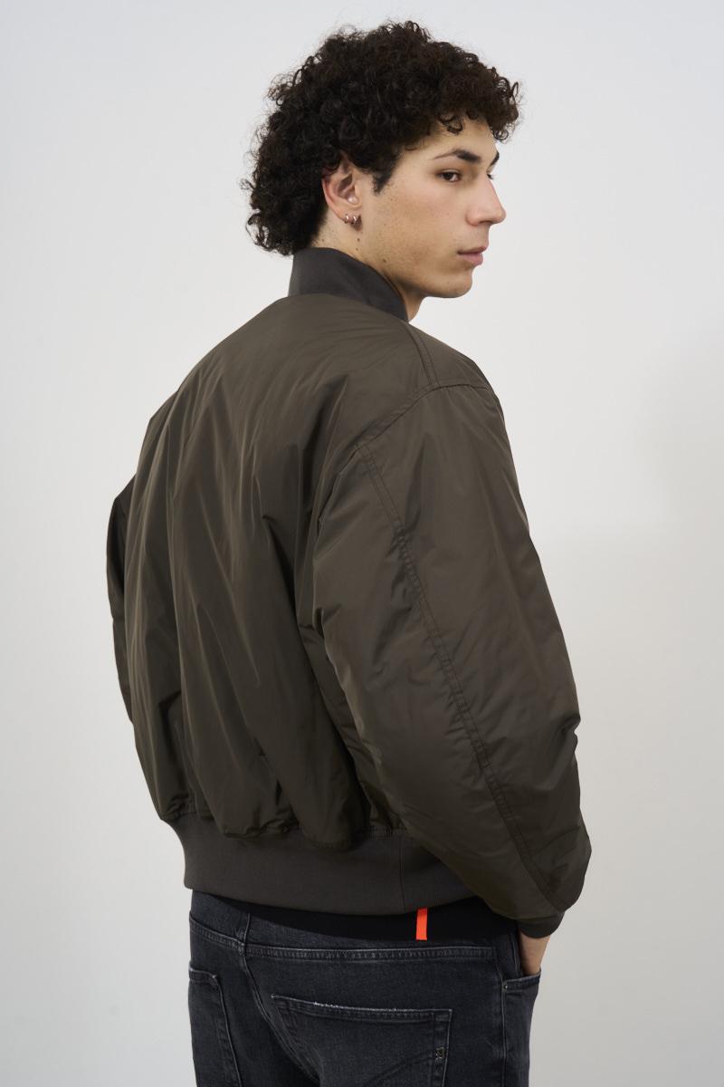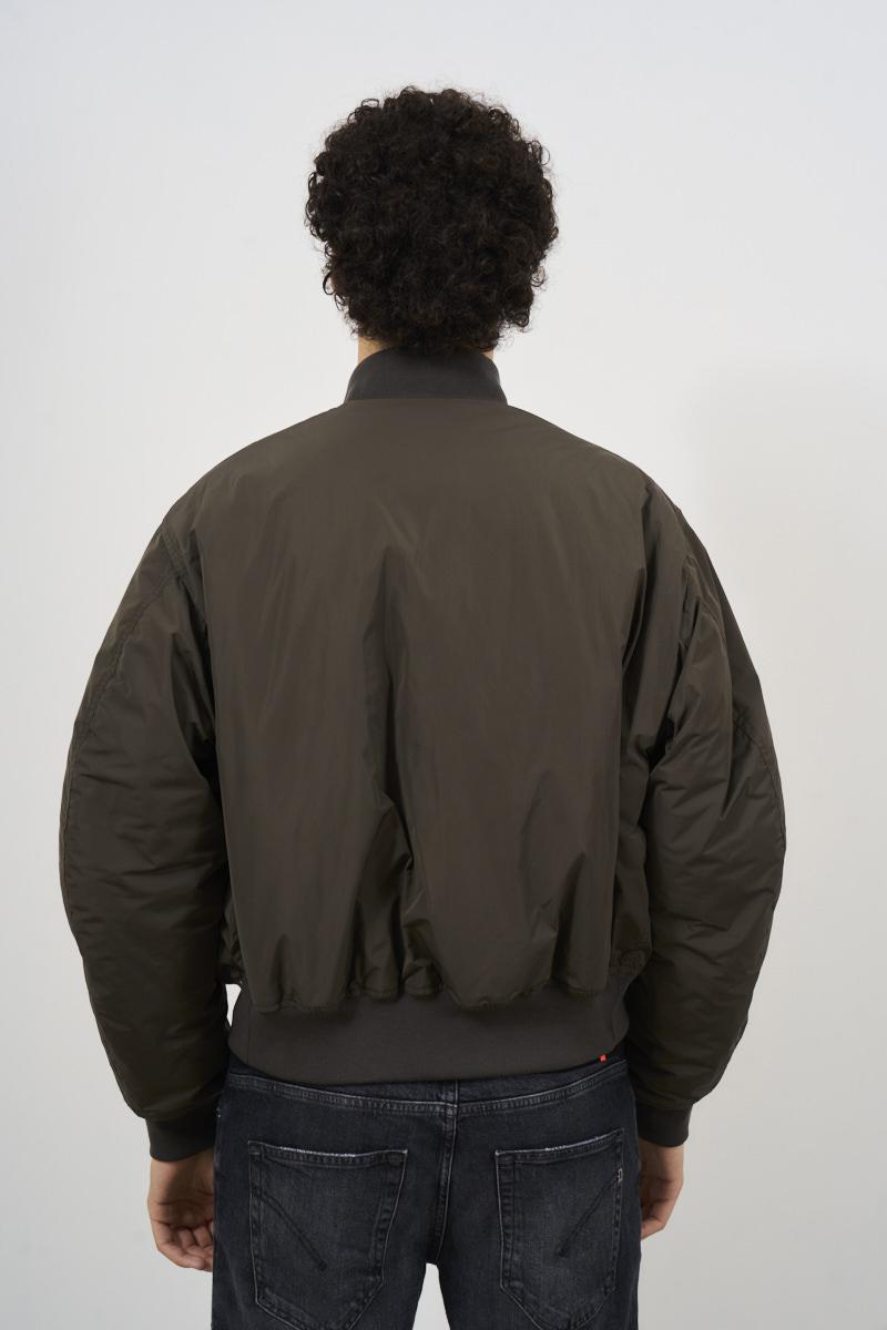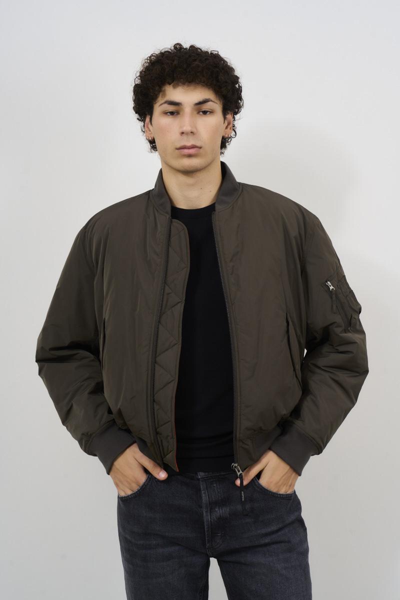 ASPESI Bomber uomo verde militare. Nylon impermeabile imbottito. Chiusura frontale con zip e le tasche oblique con patta e bottone a pressione. Il collo, i polsi e il fondo con lavorazione a costine. Composizione: 100% poliestere. Il modello è alto 187cm e indossa la taglia M.