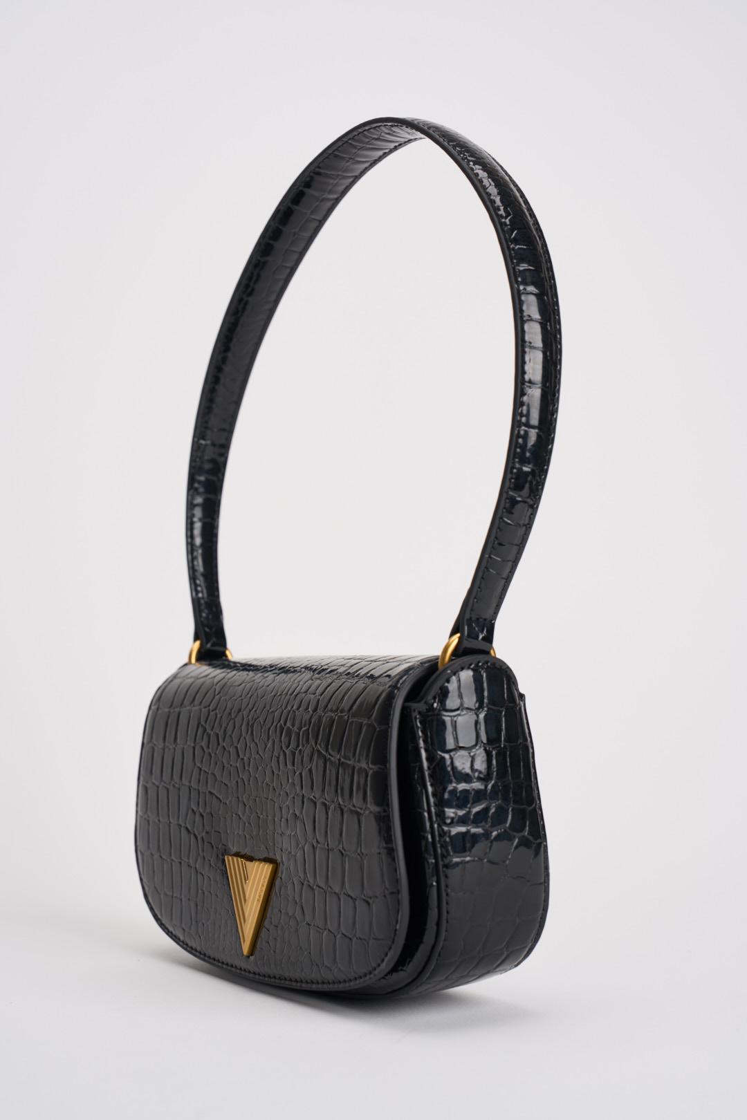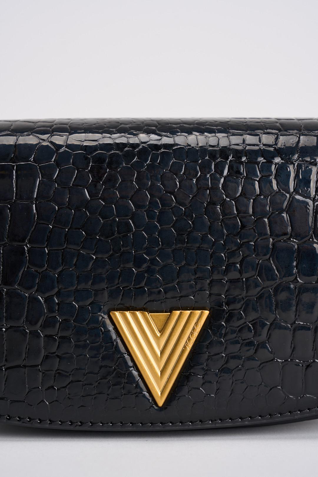 VICOLO Borsa donna in ecopelle pitonata nera. Modello con hardware dorato, un manico rigido, chiusura a pattina con bottone a pressione con calamita. Dettaglio logo V metal plate Vicolo. Tasca interna con cerniera e taschina. Dimensioni: 21x4,5x11cm.