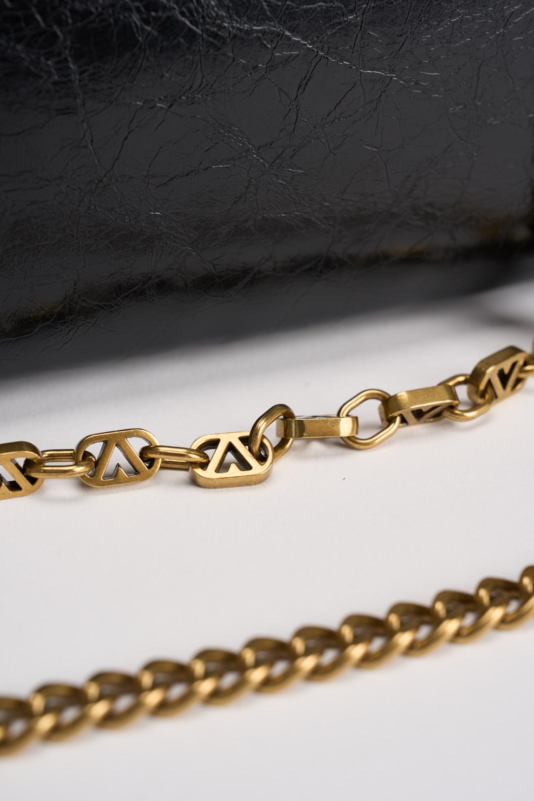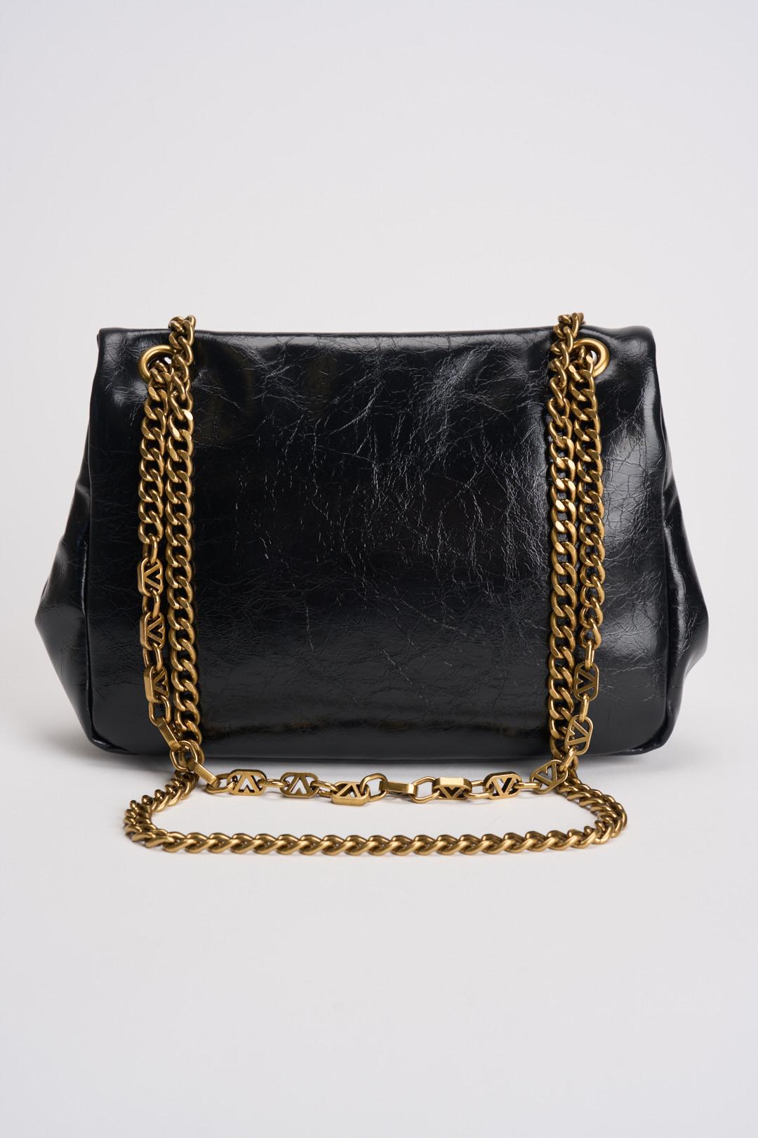 VICOLO Borsa donna semilucida nera. Modello a spalla o a tracolla con chiusura con bottone a pressione con calamita. Dettaglio fibbia V metal plate Vicolo. Tracolla con catena scorrevole dorata. Tasca interna con cerniera, taschina e tasca esterna. Bottoni laterali per rendere la borsa ancora più capiente. Composizione: 100% Poliuretano.