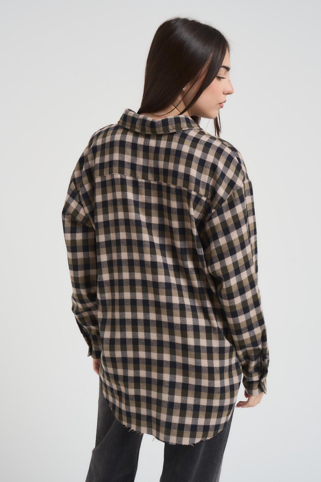 VICOLO Camicia a quadretti nera e beige. Modello con classico colletto e chiusura con bottoncini. Regular fit. Composizione: 65% poliestere 35% cotone. La modella è alta 172 cm e indossa la taglia S.
