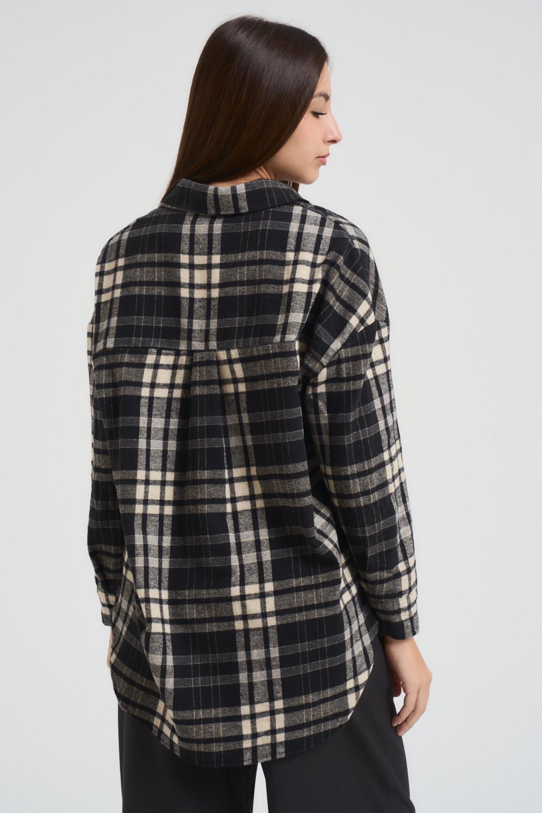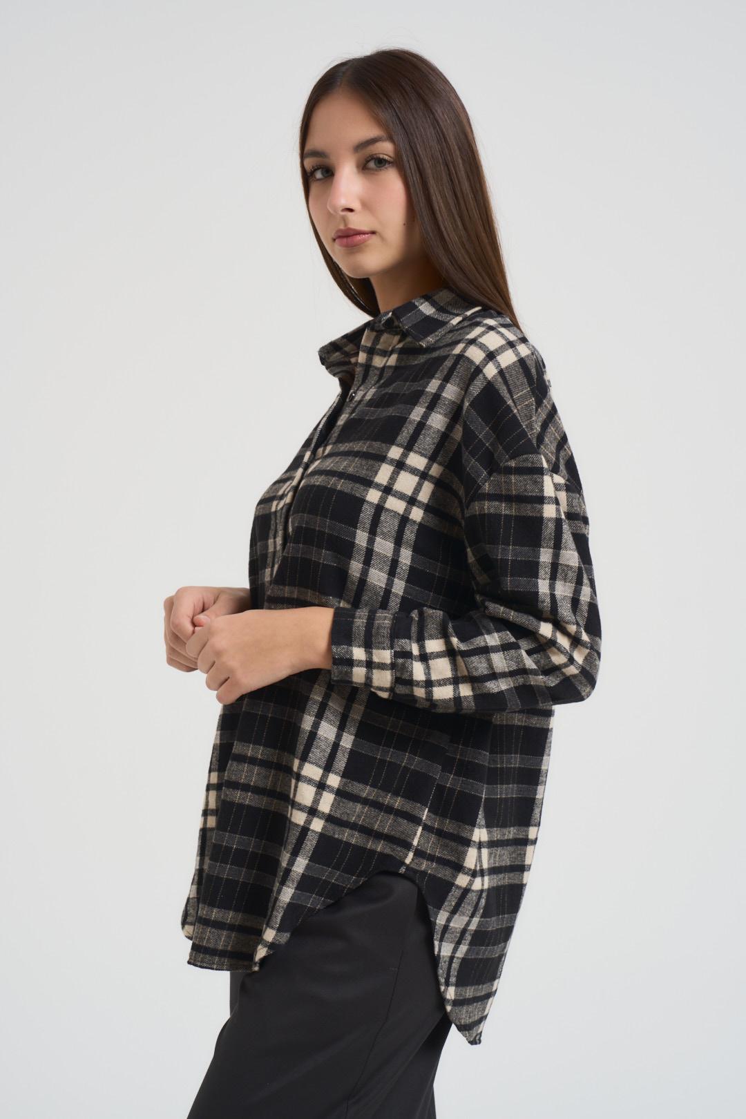 SUSY MIX Camicia donna a quadri nera. Modello over. Chiusura frontale con bottoni. Colletto classico. Giromanica sceso. Polsino con chiusura con bottone. Composizione: 80% Cotone 20% Poliestere. La modella è alta 172 cm e indossa la taglia UNI.