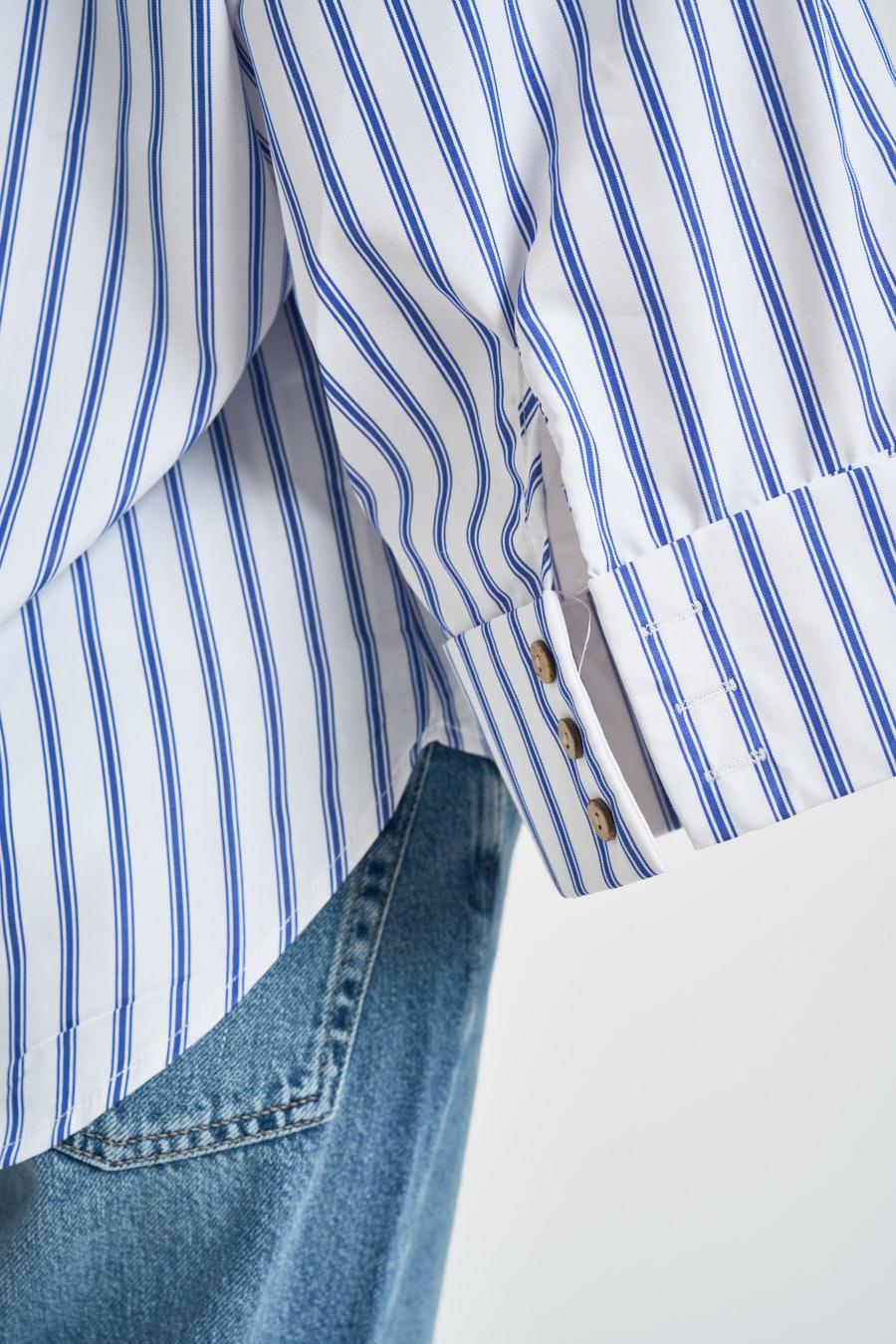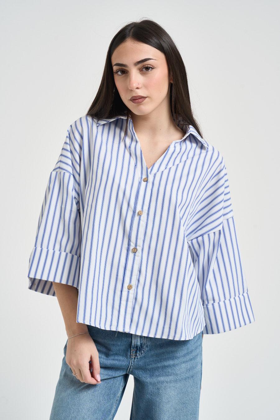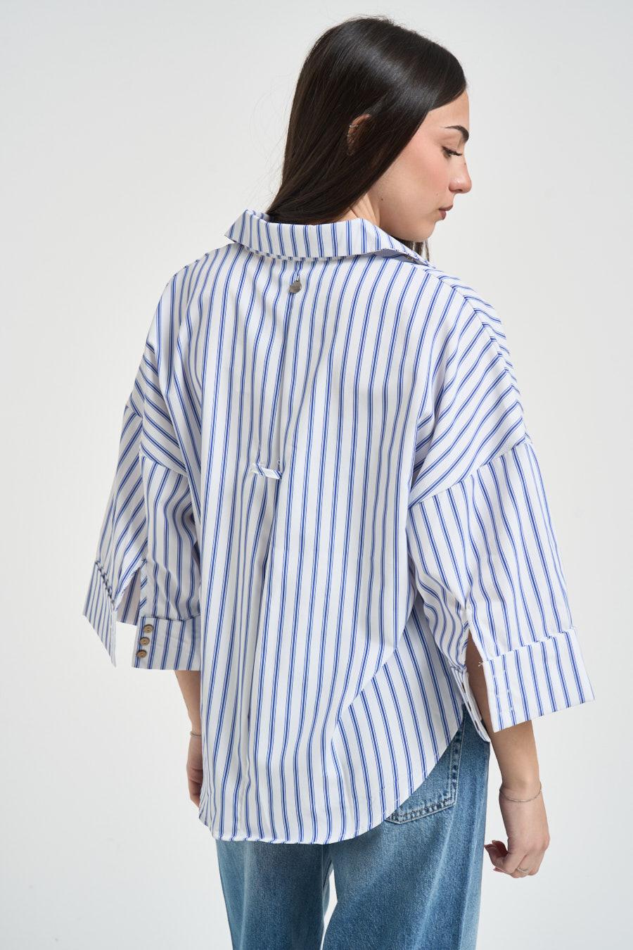 TWO WAY Camicia donna manica a tre quarti celeste. Modello con colletto classico e chiusura frontale con bottoni, maniche a tre quarti con polsini ampi e dettagli di bottoni.Linea morbida con fondo arrotondato leggermente più lungo sul retro. Spalle scese per un look rilassato e contemporaneo. Fit over. Fantasia a righe. Composizione: 100% cotone. La modella è alta 172 cm e indossa la taglia S.