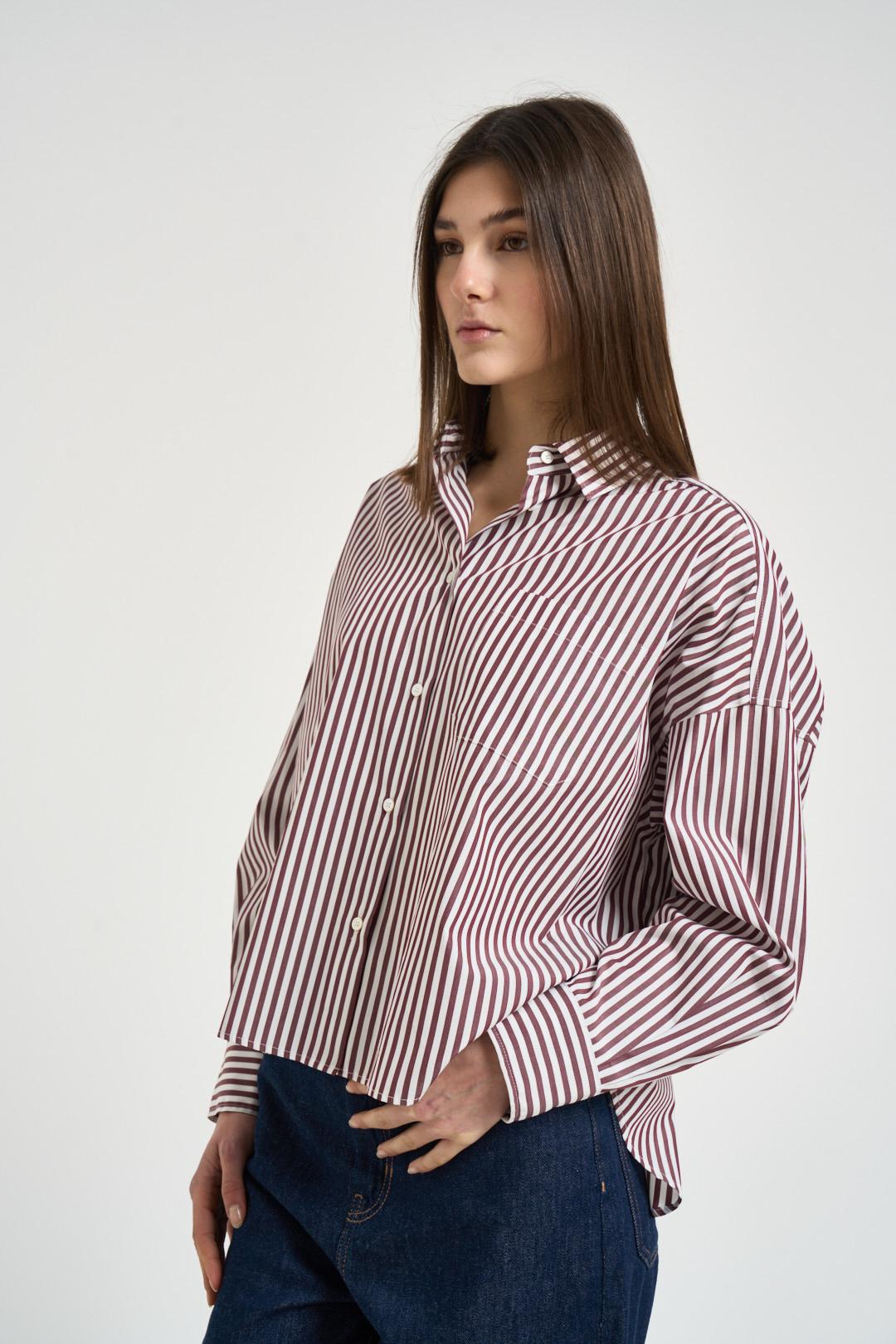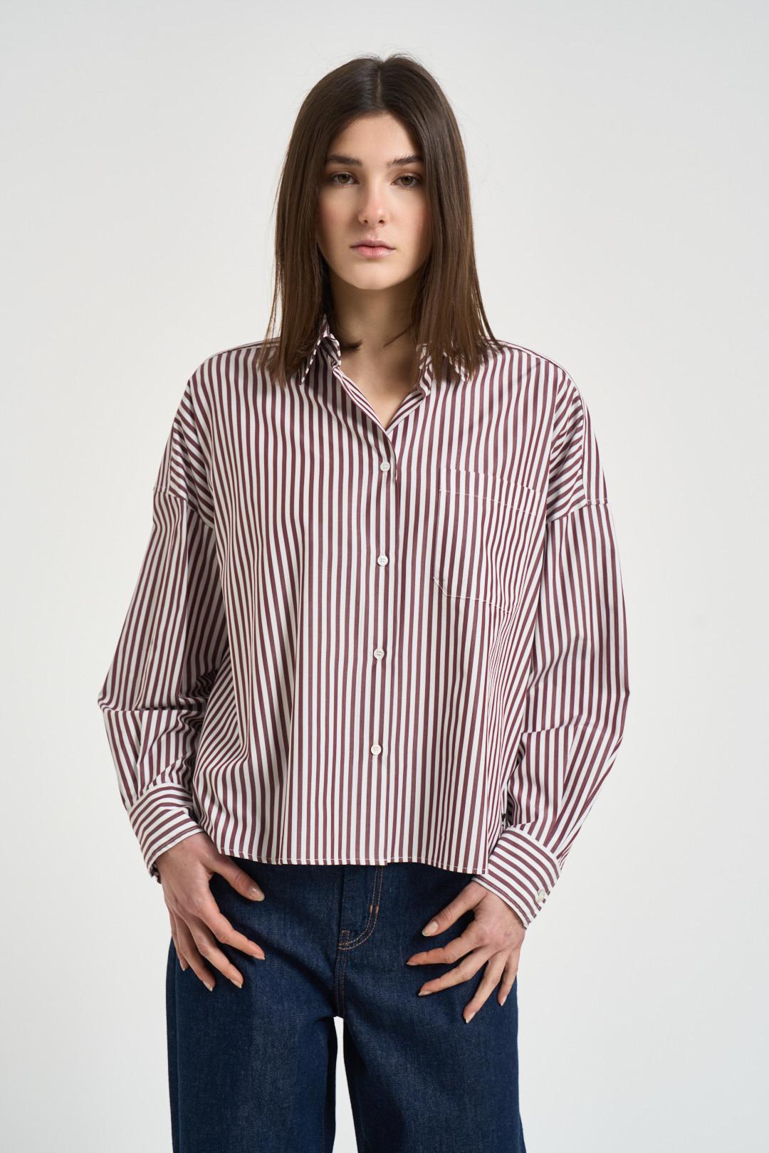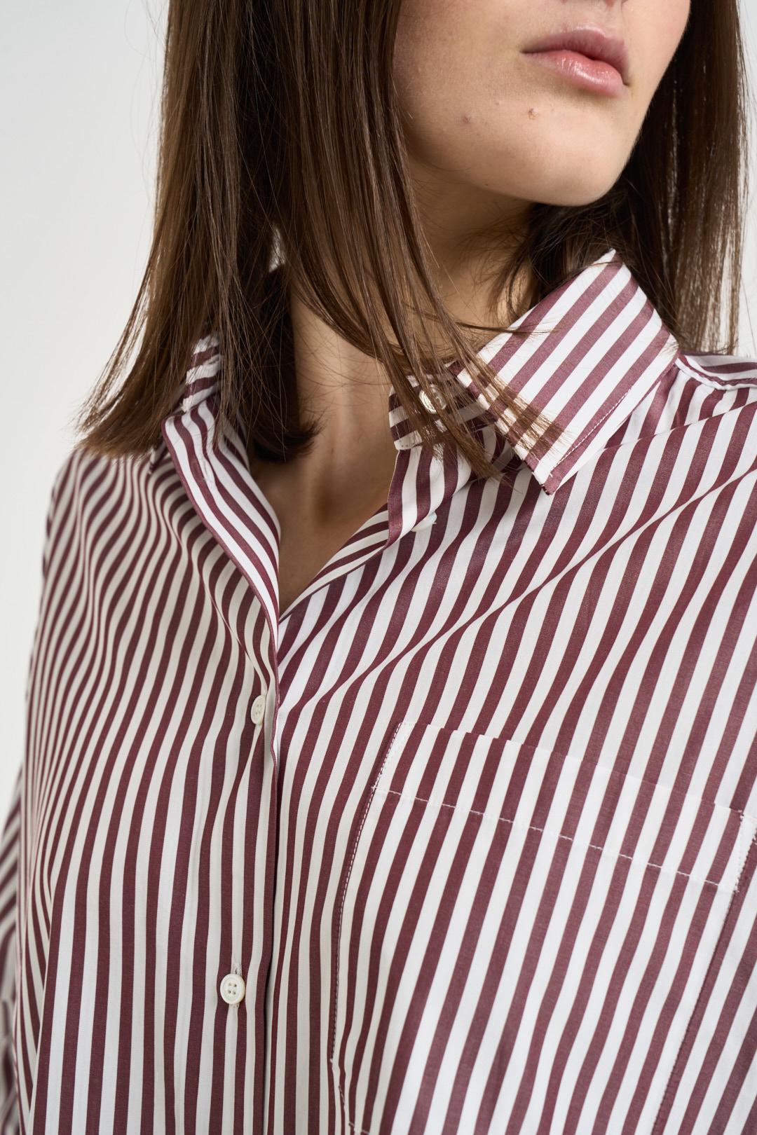MAX MARA WEEKEND Camicia donna a righe bordeaux. Modello over in popeline, maniche lunghe, polsini con bottone e taschino applicato sul petto. Fondo stondato leggermente più lungo sul retro. Composizione: 100% cotone. La modella è alta 176cm e indossa la taglia 38.