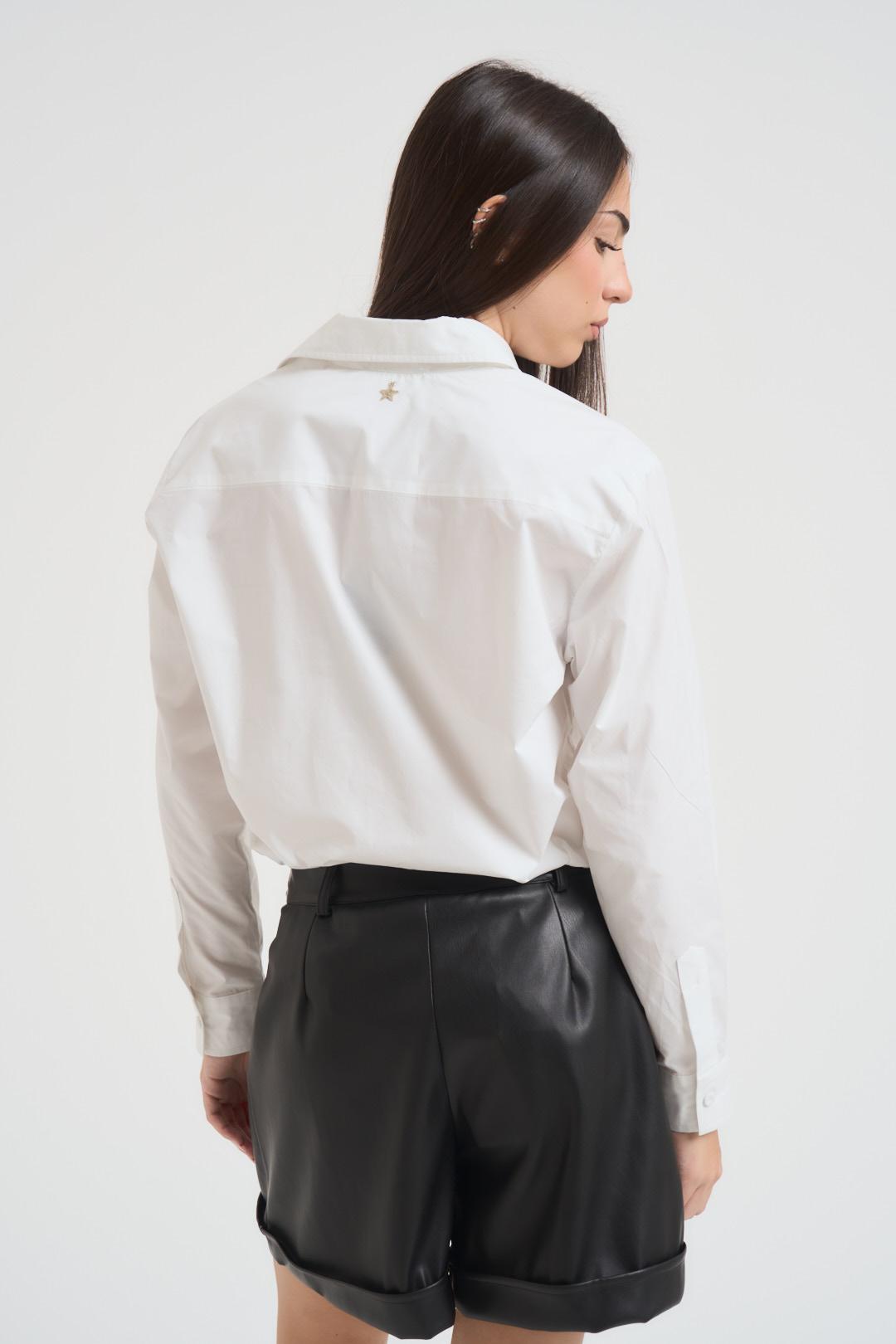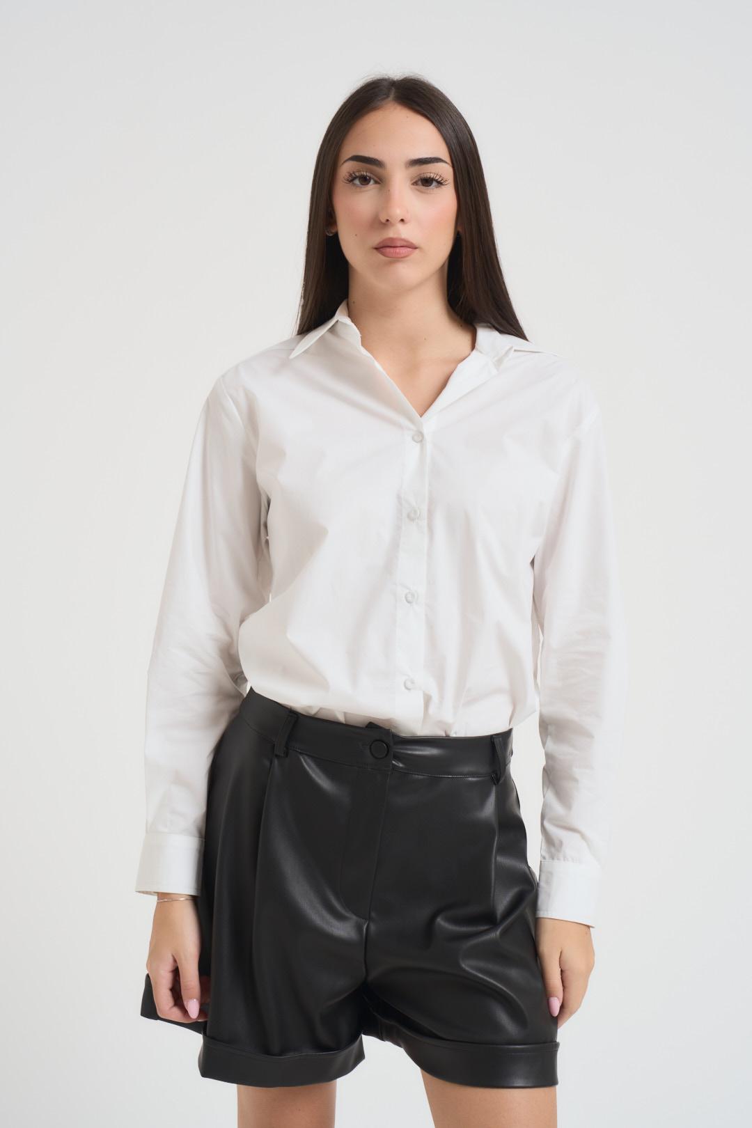 SOUVENIR CLUBBING Camicia donna bianca. Modello con classico colletto, fit leggermente sfiancato, collo classico, maniche lunghe. Composizione: 100% cotone. La modella è alta 172 cm e indossa la taglia S.