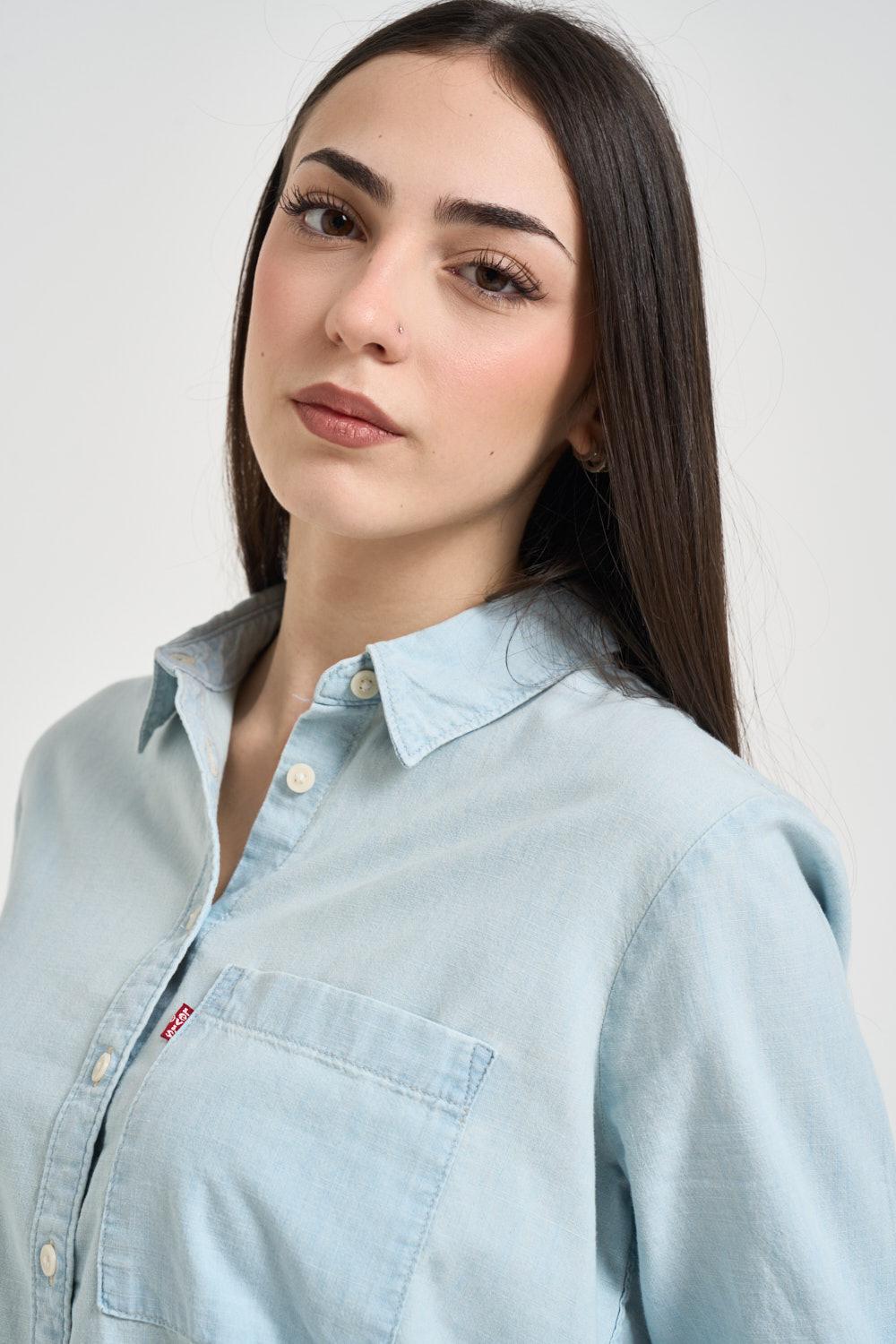 LEVI'S Camicia donna chambray celeste. Modello con colletto classico e chiusura frontale con bottoni. Taschino applicato sul petto impreziosito dalliconica etichetta rossa Levis. Maniche lunghe con possibilità di risvolto e bottone di fissaggio. Fondo leggermente arrotondato e carré posteriore con piega centrale per una vestibilità confortevole. Etichetta logo rossa sul davanti. Composizione: 100% Cotone. La modella è alta 172cm e indossa la taglia S.