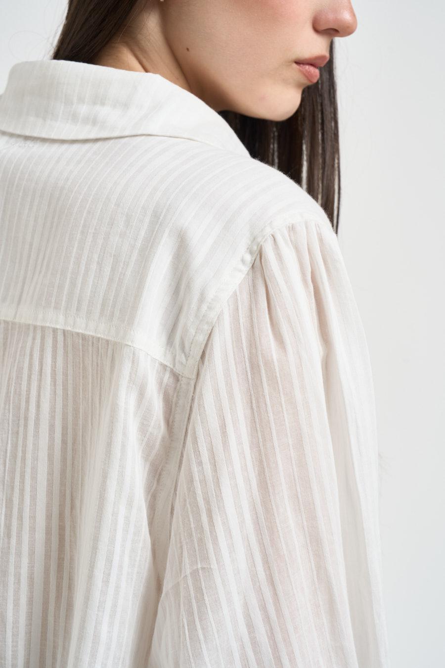 GRACE AND MILA Camicia donna con manica a sbuffo bianca. Modello regular fit. Chiusura frontale con bottoncino. Scollo a V. Colletto classico. Composizione: 100% cotone. La modella è alta 172 cm e indossa la taglia XS.
