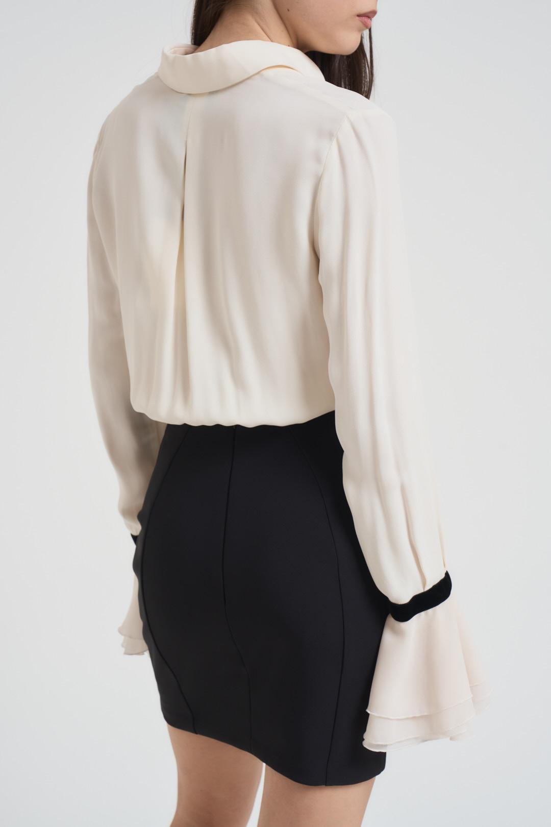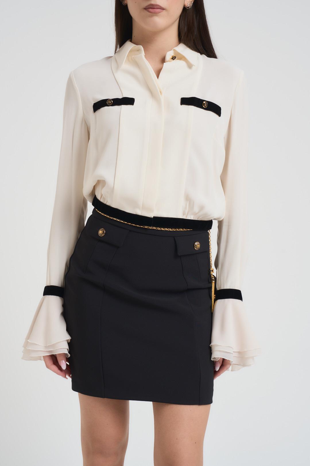 ELISABETTA FRANCHI Camicia donna con maniche rouche ecru. Modello regular fit. Chiusura a scomparsa con bottoni. Colletto classico. Manica lunga. Dettaglio a contrato sul petto e su polso con bottone. Fondo con orlo curvo. Composizione: 100% viscosa. La modella è alta 172 cm e indossa la taglia 40.