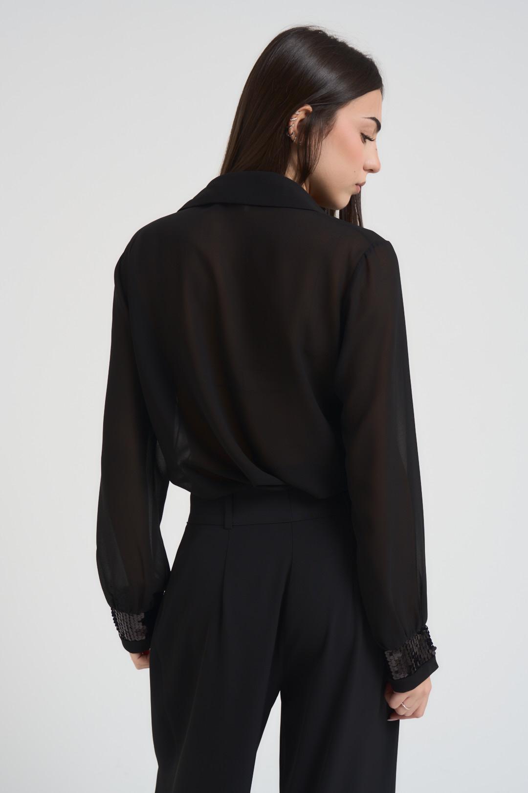 LOKITA MILANO Camicia donna con paillettes nera. Modello con manica semitrasparente e paillettes sul petto. Regular fit. Composizione: poliestere. La modella è alta 172cm e indossa la taglia S.