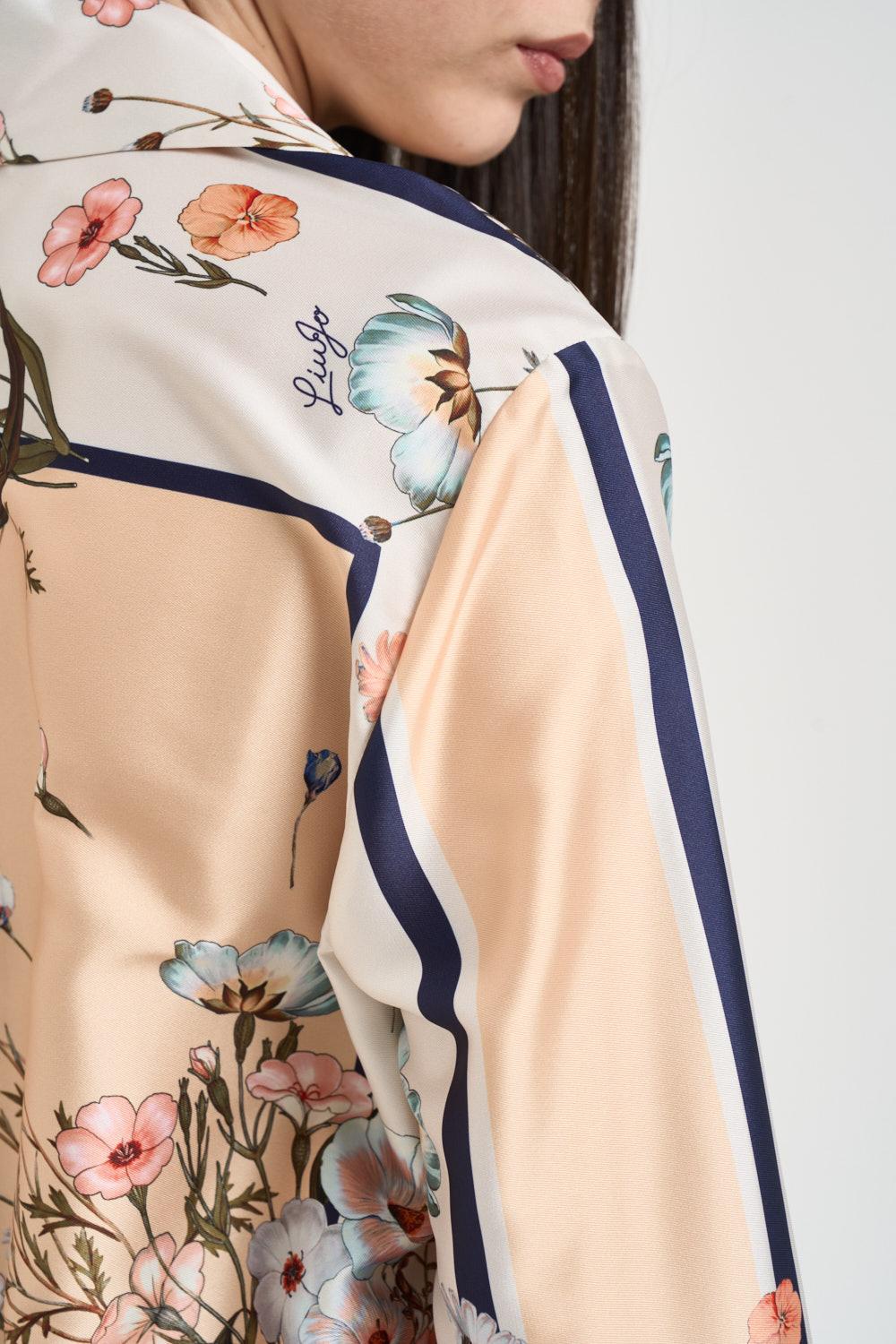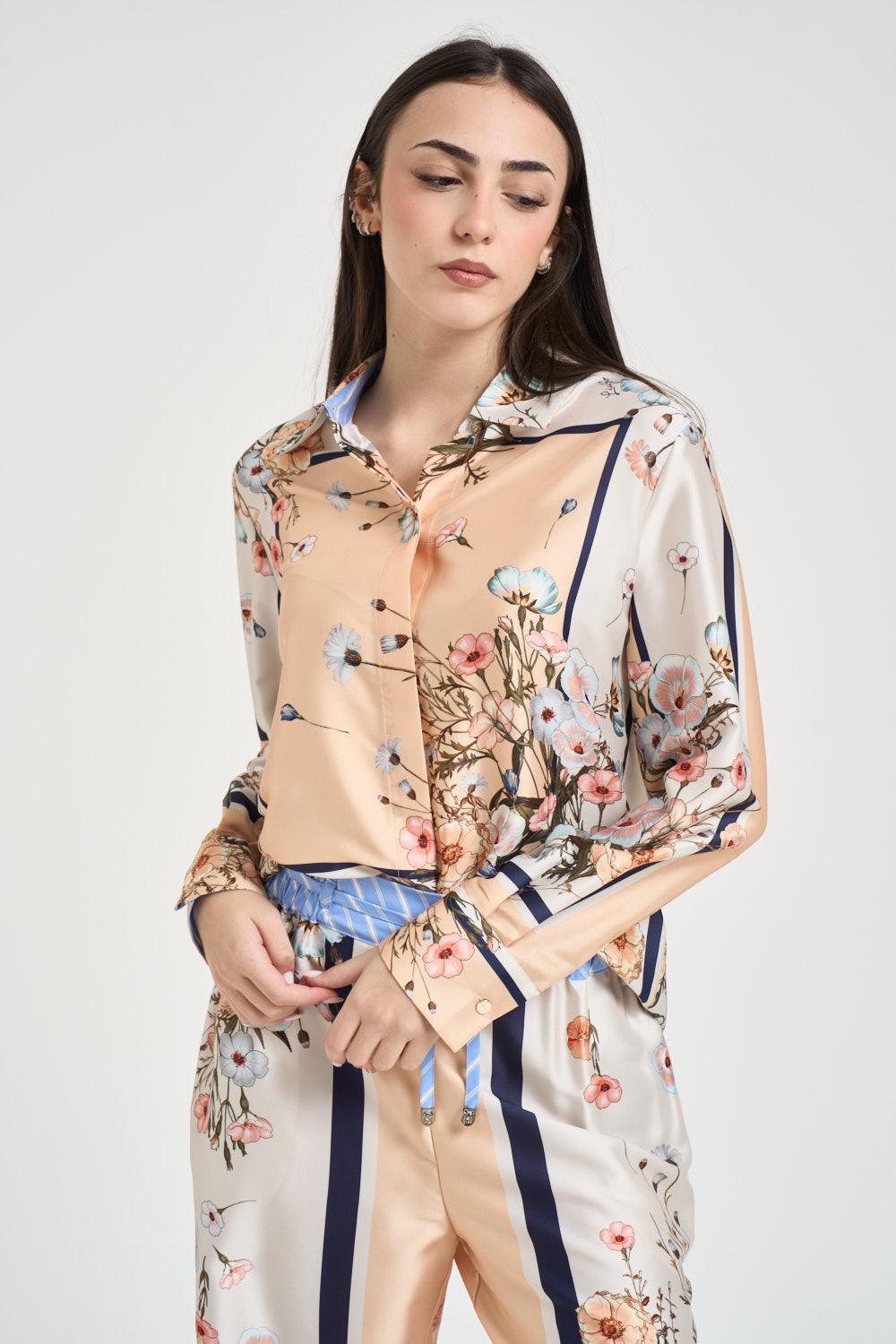 LIU JO Camicia donna floreale satinata. Modello dalla linea morbida con collo a camicia classico e chiusura frontale con bottoni. Multicolor su base color pesca, arricchita da inserti a righe verticali a contrasto che definiscono la silhouette. Maniche lunghe con polsini abbottonati. Presente Liu Jo integrata nella stampa sul retro. Composizione: 100% poliestere. La modella è alta 172cm e indossa la taglia 40.