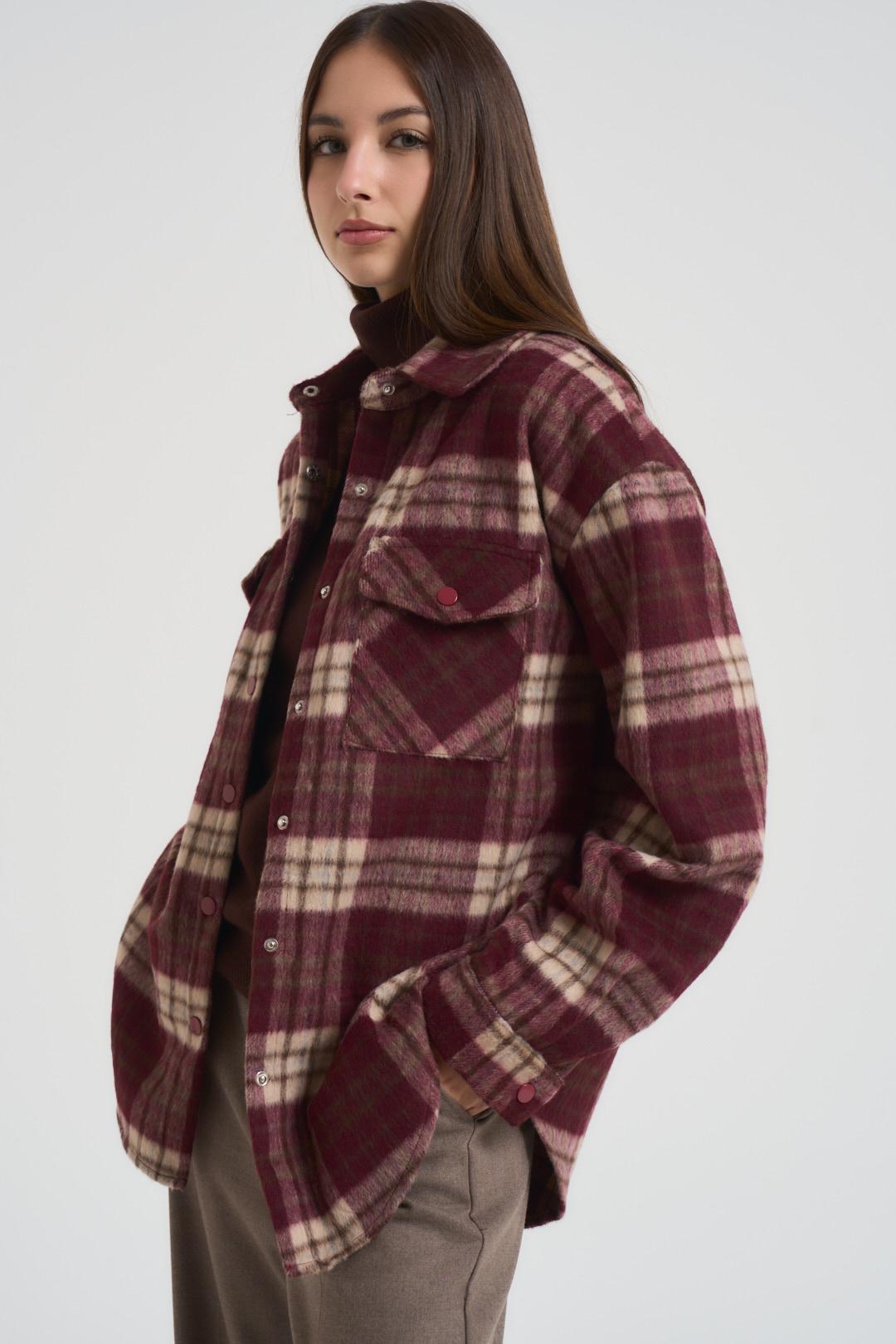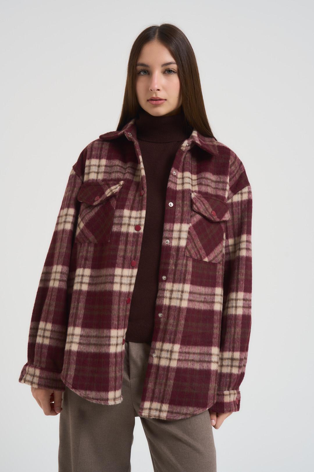 SUSY MIX Camicia donna over a quadri vino. Modello dalla vestibilità ampia. Chiusura frontale con bottoni. Colletto classico. Manica lunga. Chiusura polso con bottone. Due tasche frontali con patta e bottone. Composizione: Misto cotone. La modella è alta 176 cm e indossa la taglia UNI.