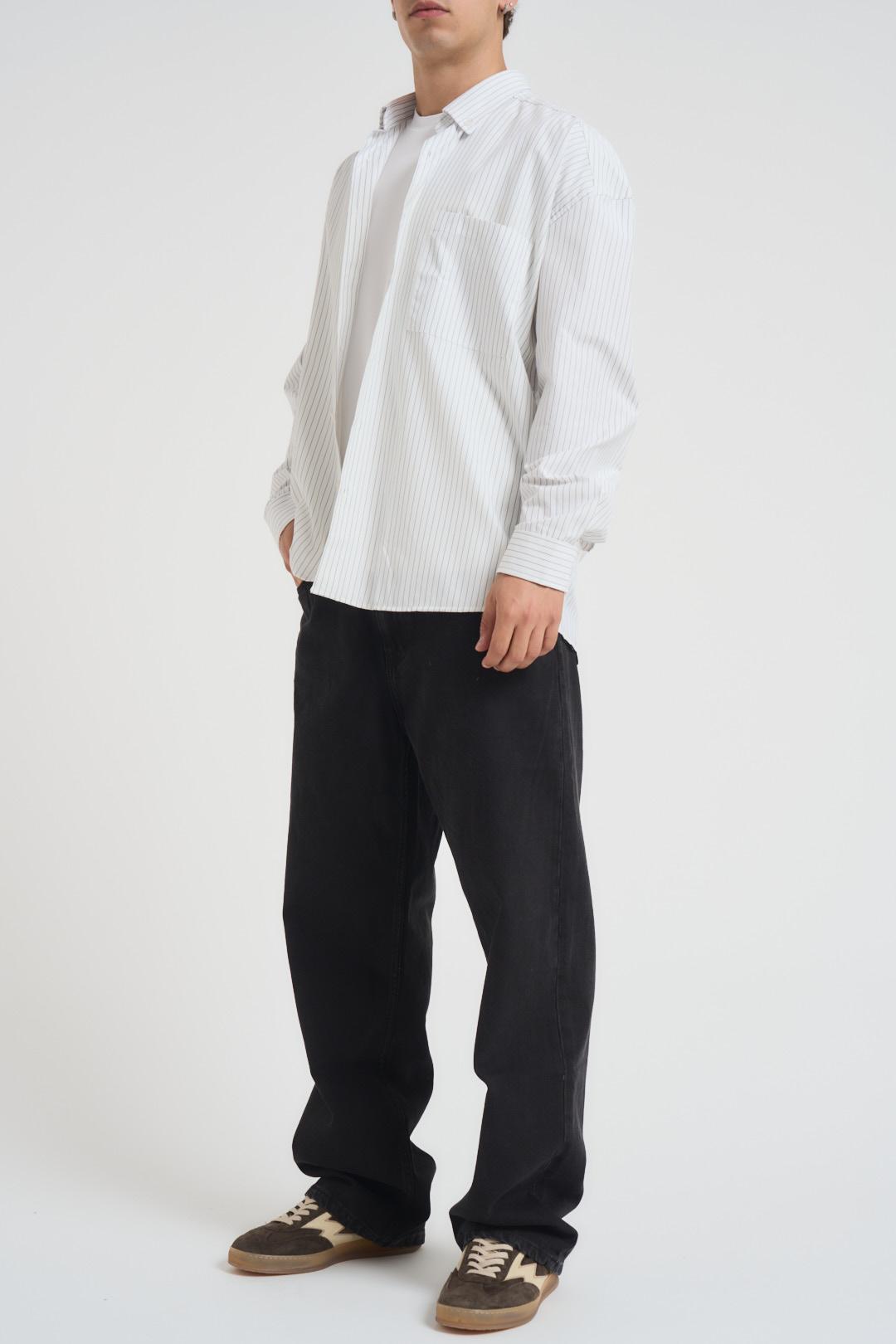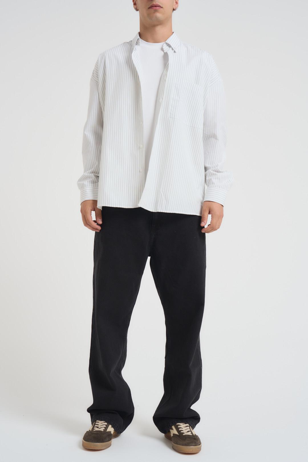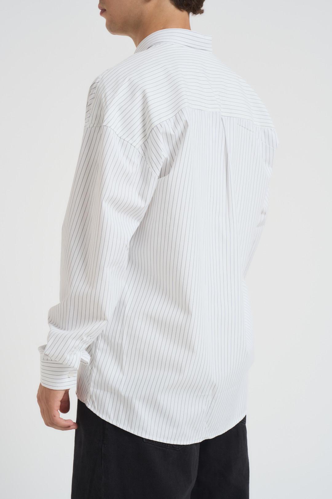 OTHERS BOYZ CLUB Camicia uomo a righe bianca. Modello a manica lunga. Righe verticali e sui polsi righe orizzontali. Chiusura sul davanti con bottoni. Taschino. Spalla leggermente scesa. Composizione: 100% Cotone. Il modello è alto 185 cm e indossa la taglia L.