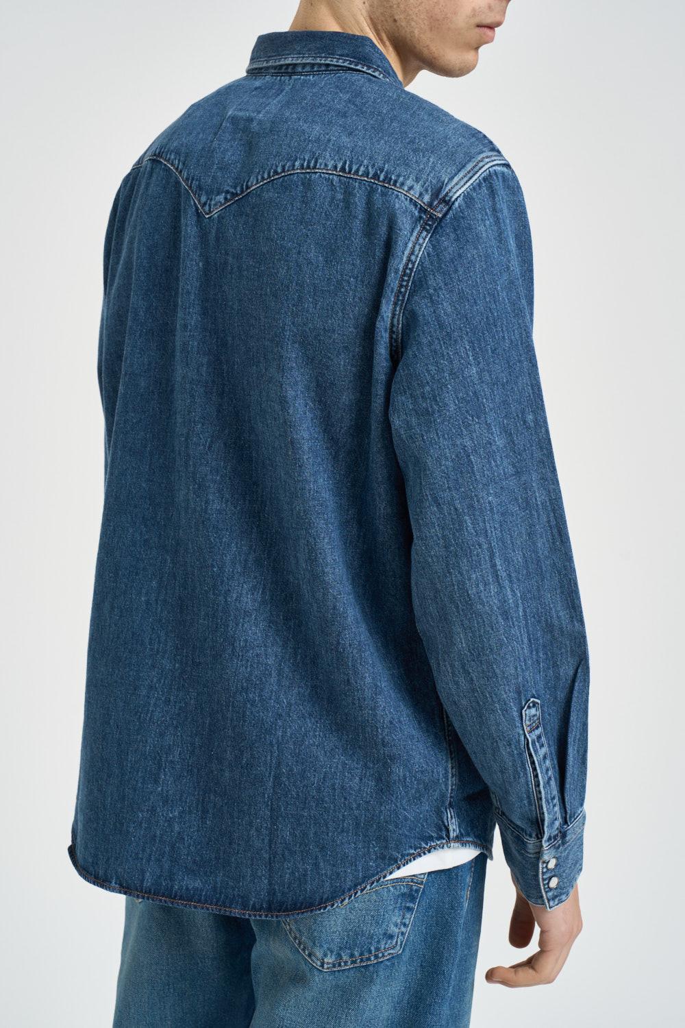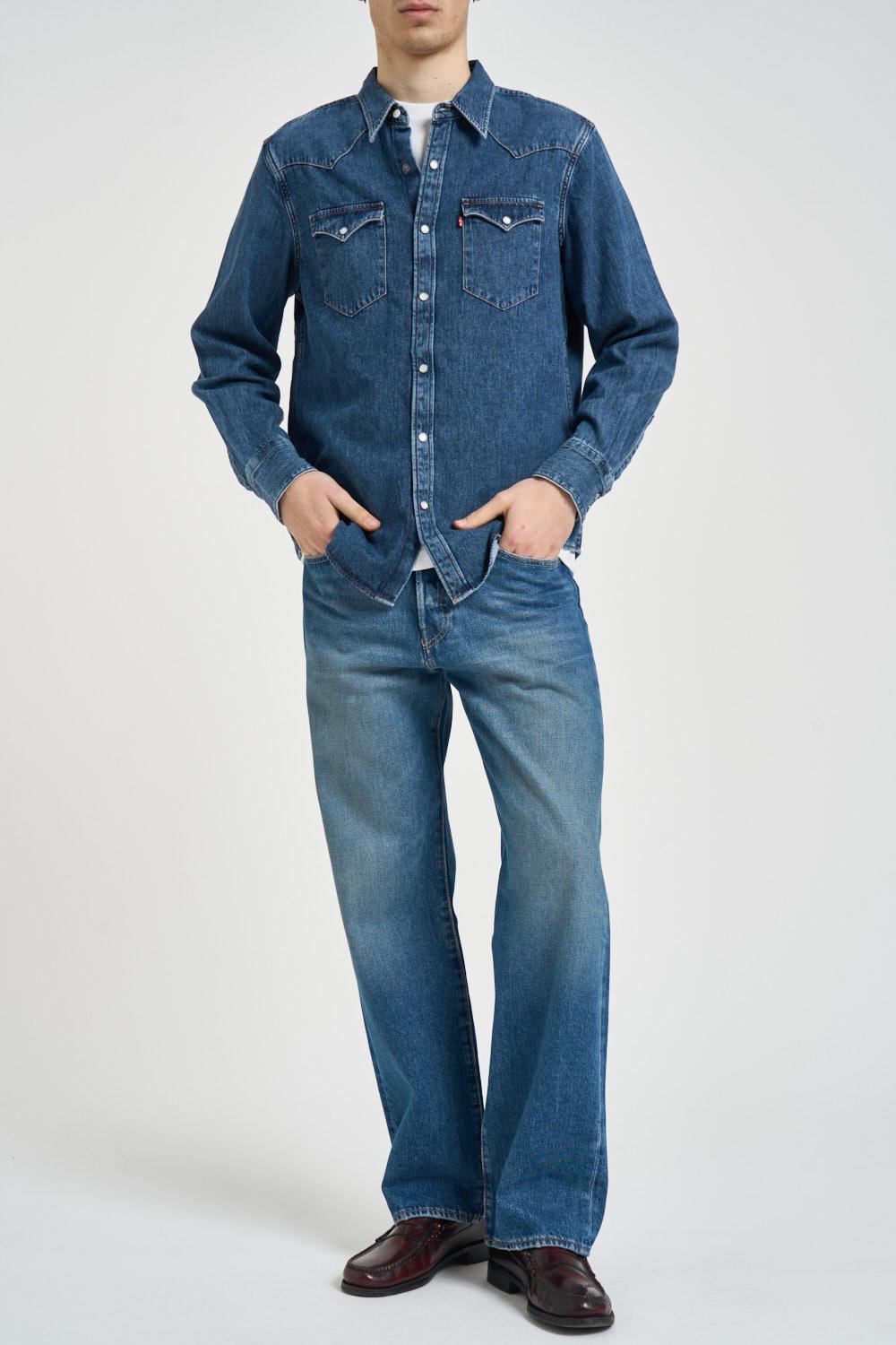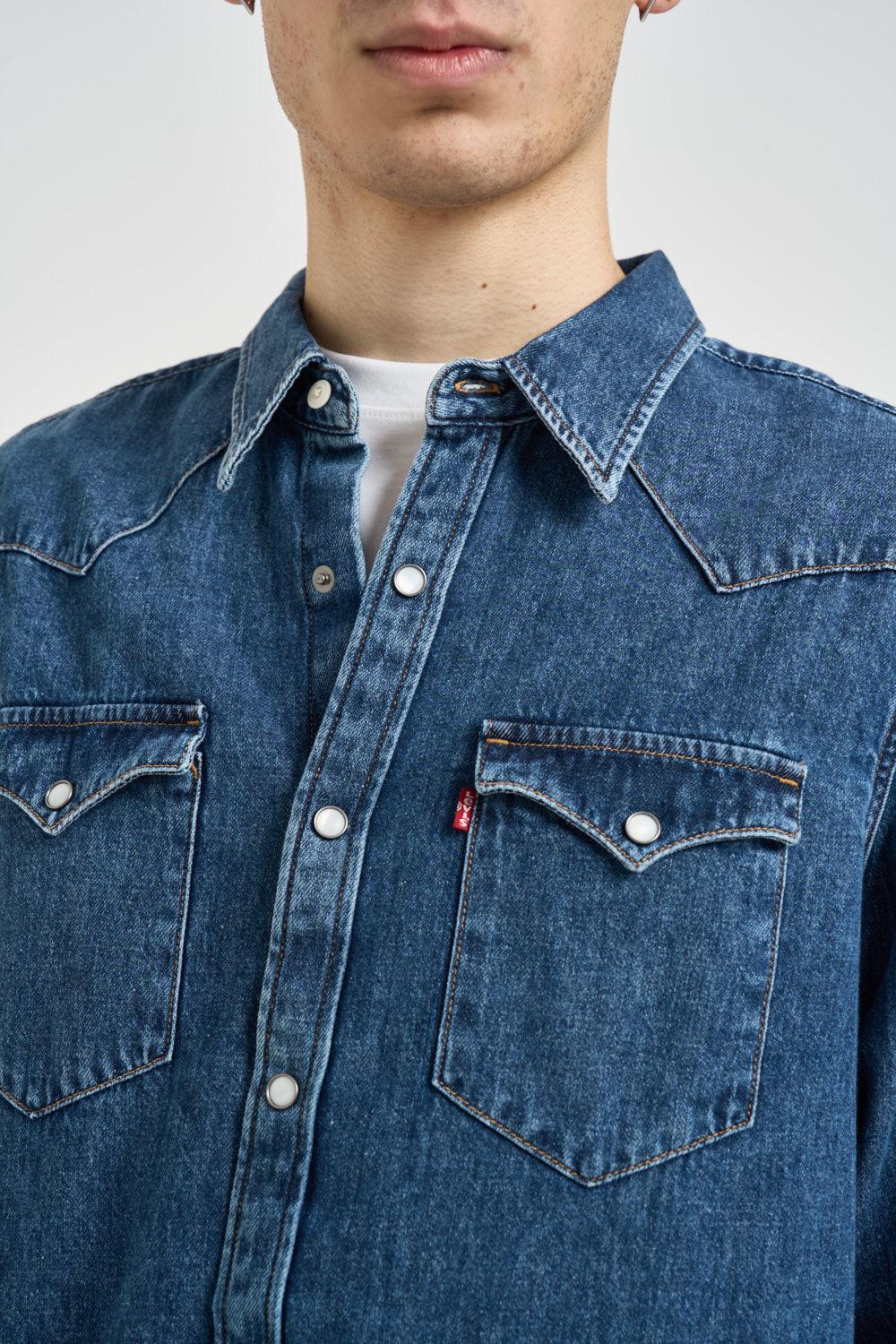 LEVI'S Camicia uomo Barstow in denim blu. Modello in stile western con classico colletto e due tasche con bottoni sul petto. Chiusura con bottoni a pressione. Manica lunga. Bottoni su polsino. Composizione: 100% cotone. Il modello è alto 190cm e indossa la taglia L.