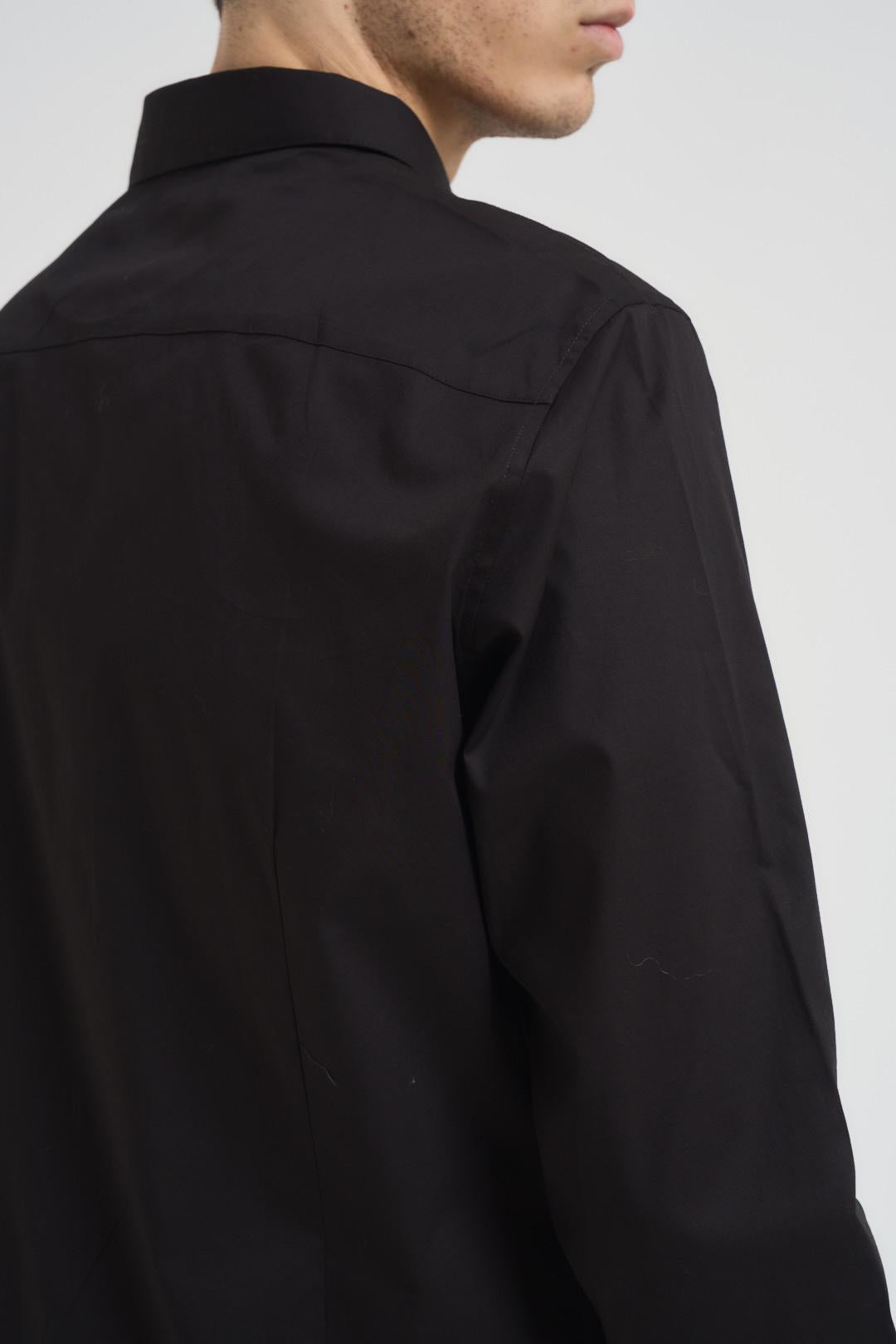 ARMANI EXCHANGE Camicia uomo manica lunga nera. Modello slim fit. Collo classico, chiusura frontale con bottoni, fondo manica chiusura con bottoni. Logo tono su tono. Composizione: 98% Cotone 2% Elastan. Il modello è alto 190cm e indossa la taglia L.