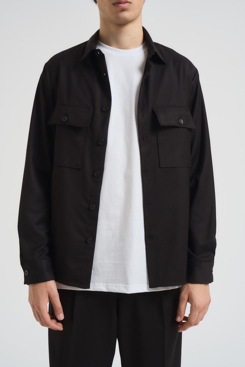 IMPERIAL Camicia uomo nera. Modello con classico colletto, chiusura con bottoni e due tasche a patta sul davanti con bottone. Composizione: 78% poliestere 18% viscosa 4% elastane. Il modello è alto 190 cm e indossa la taglia L.