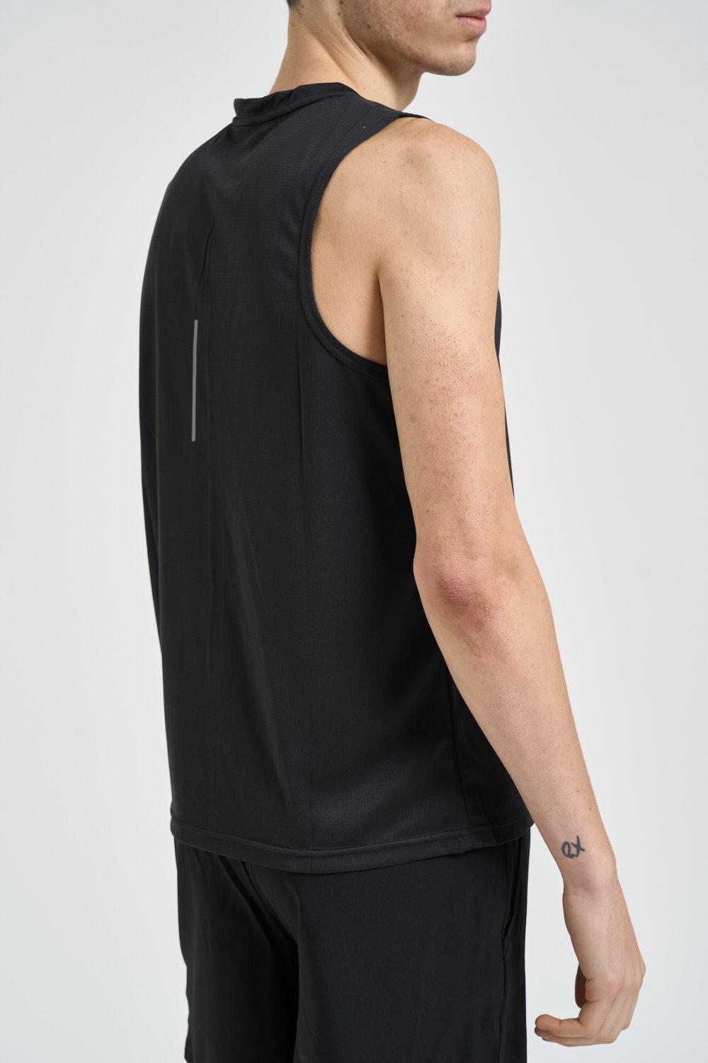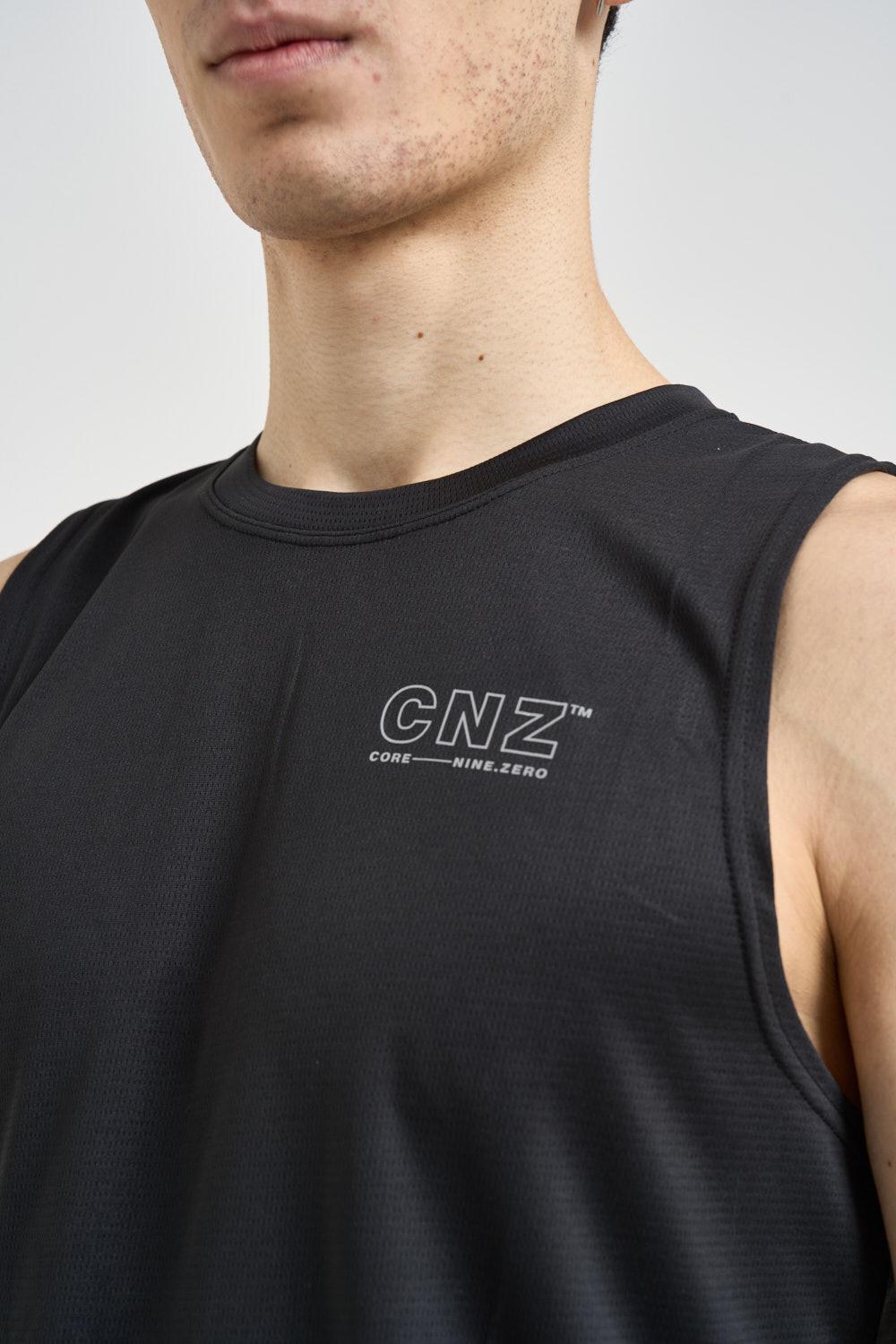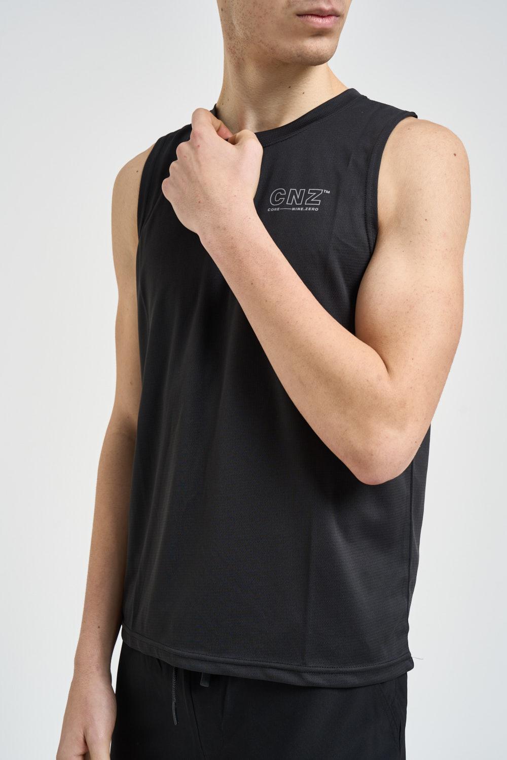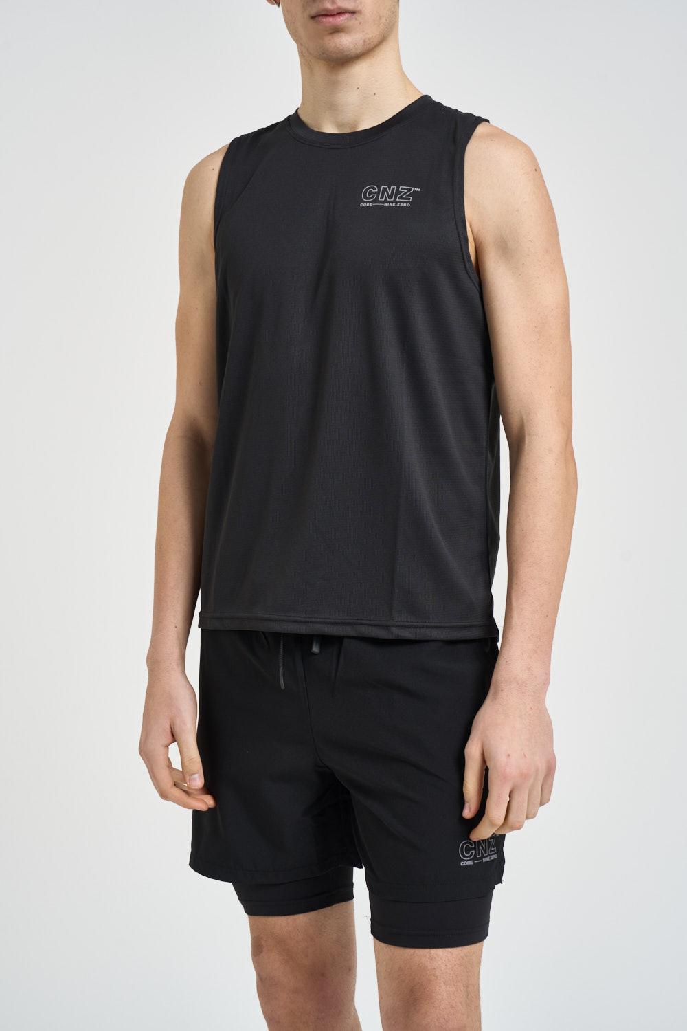 JACK & JONES Canotta uomo sportiva nera. Modello regular fit. Smanicato. Girocollo. Realizzato in tessuto tecnico leggero e traspirante. Design essenziale con taglio pulito e finiture minimal. Sul petto è presente il logo CNZ Core Nine-Zero stampato a contrasto. Composizione: 100% poliestere. Il modello è alto 190cm e indossa la taglia L.
