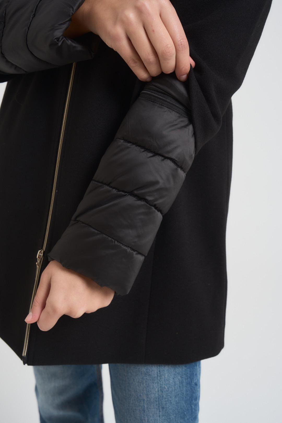 ADIMARI Cappotto donna con pettorina staccabile nero. Modello lungo. Pettorina con chiusura frontale con zip e manica a tre quarti. Due tasche a filetto. Collo alto. Piumino sottostante con collo alto. Chiusura frontale con bottoni a pressione. Manica staccabile tramite zip. Composizione: nylon e poliestere. La modella è alta 176 cm e indossa la taglia S.