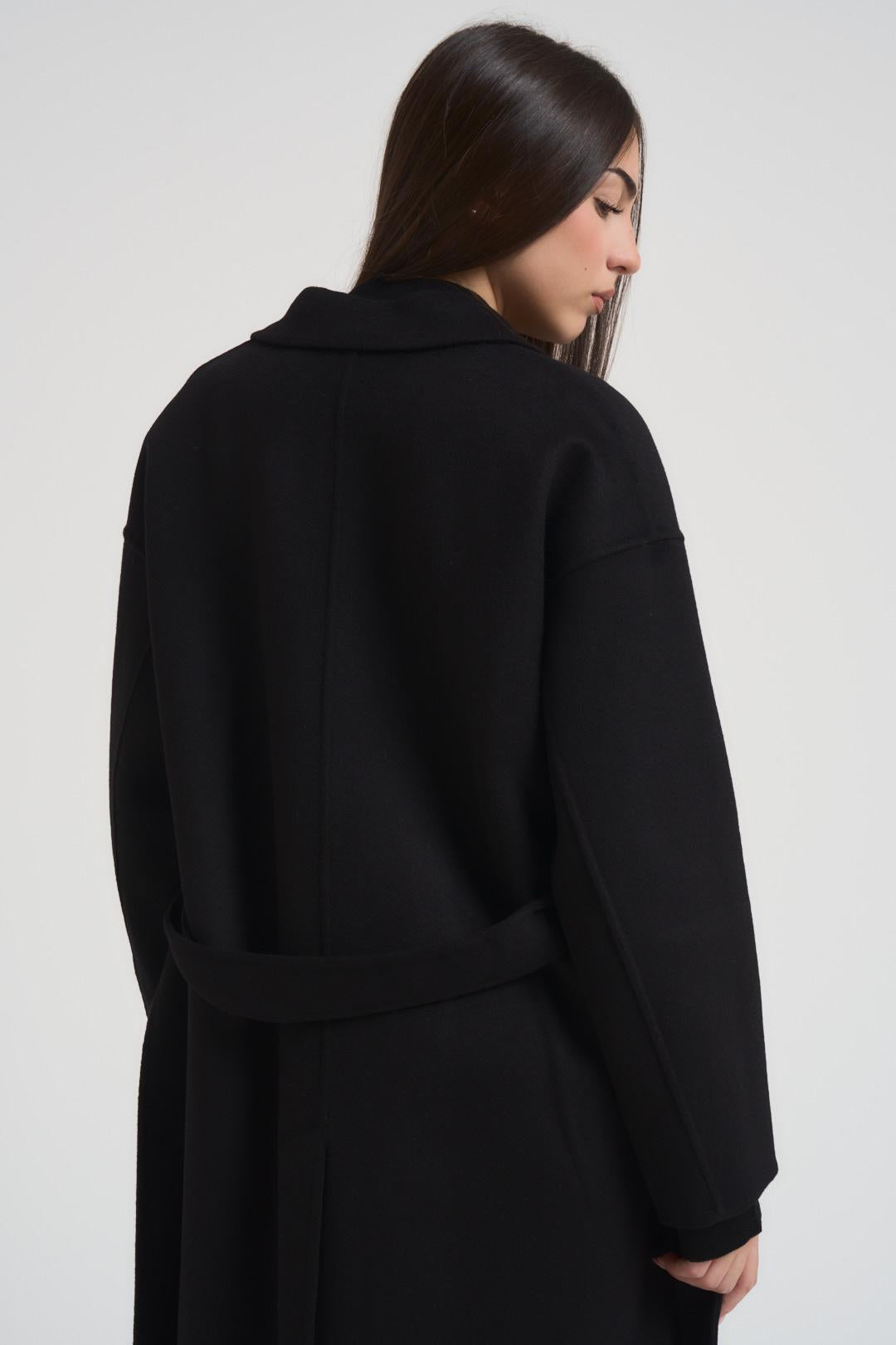 VITTO Cappotto donna doppiopetto lungo nero. Modello over, chiusura con bottoni, cintura in vita, collo con rever. Composizione: 50% lana 50% poliestere. La modella è alta 172 cm e indossa la taglia S.