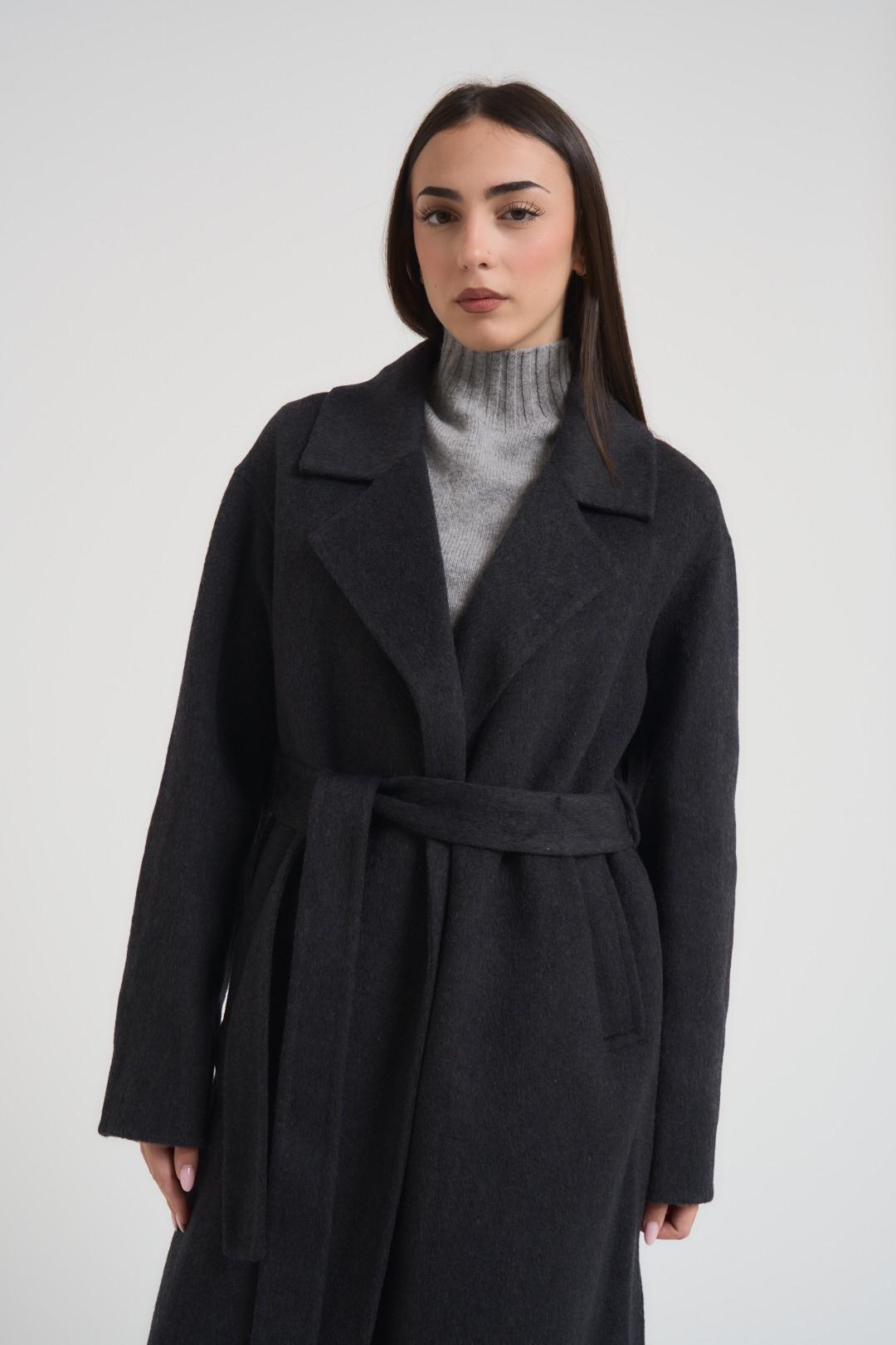 VITTO Cappotto donna lungo antracite. Modello collo con rever, cintura in vita, tasche laterali con patta, apertura con bottone su fondo manica. Composizione: 50% lana 50% poliestere. La modella è alta 172 cm e indossa la taglia S.
