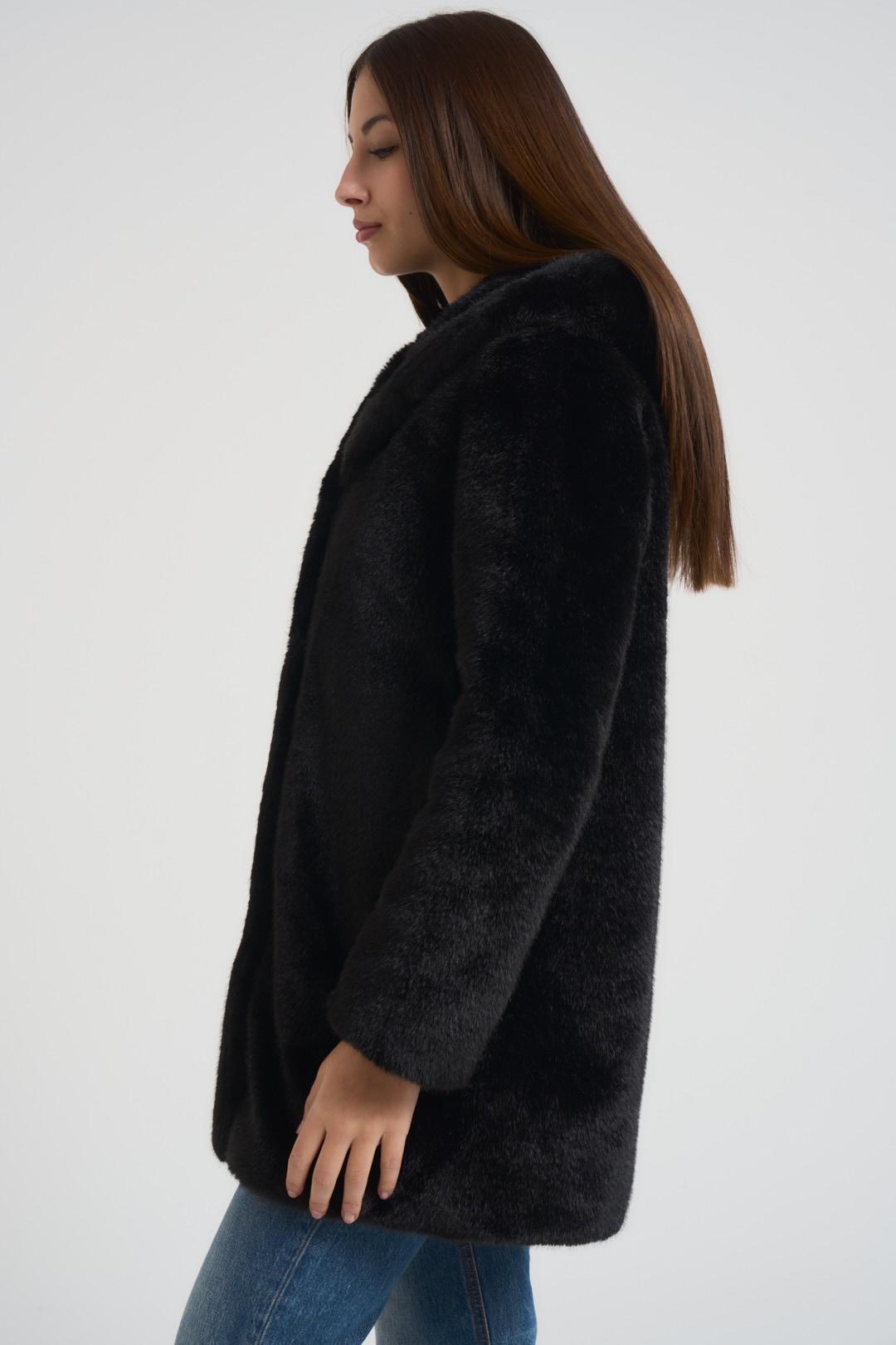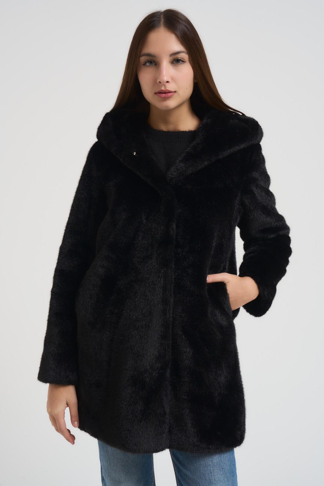 CENSURED Cappotto in ecopelliccia midi nero. Modello con cappuccio fisso, chiusura con bottoni a pressione nascosti. Vestibilità regular. Composizione: 100% poliestere. La modella è alta 176cm e indossa la taglia S.