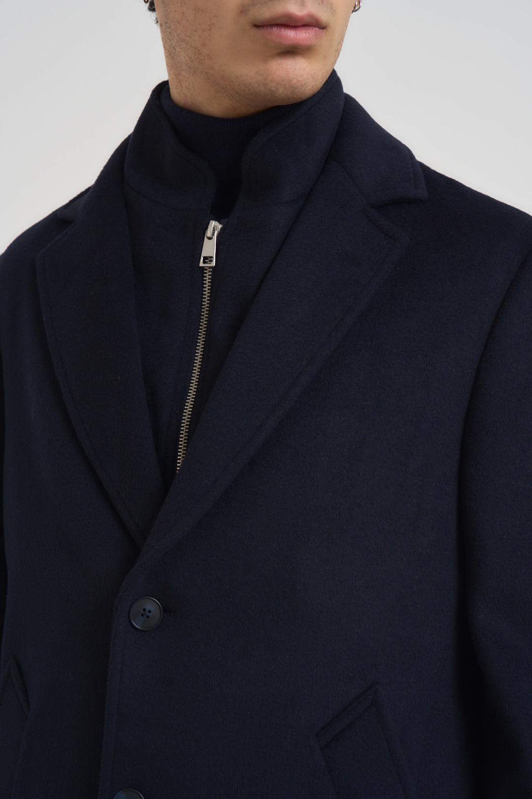 AT.P.CO Cappotto uomo midi blu notte. Modello con pettorina removibile interna trapuntata nylon con chiusura a zip. Chiusura principale a due bottoni, due tasche laterali a filetto, collo con revers. Composizione: 57%lana 33% poliestere 10%seta. Il modello è alto 190cm e indossa la taglia L.