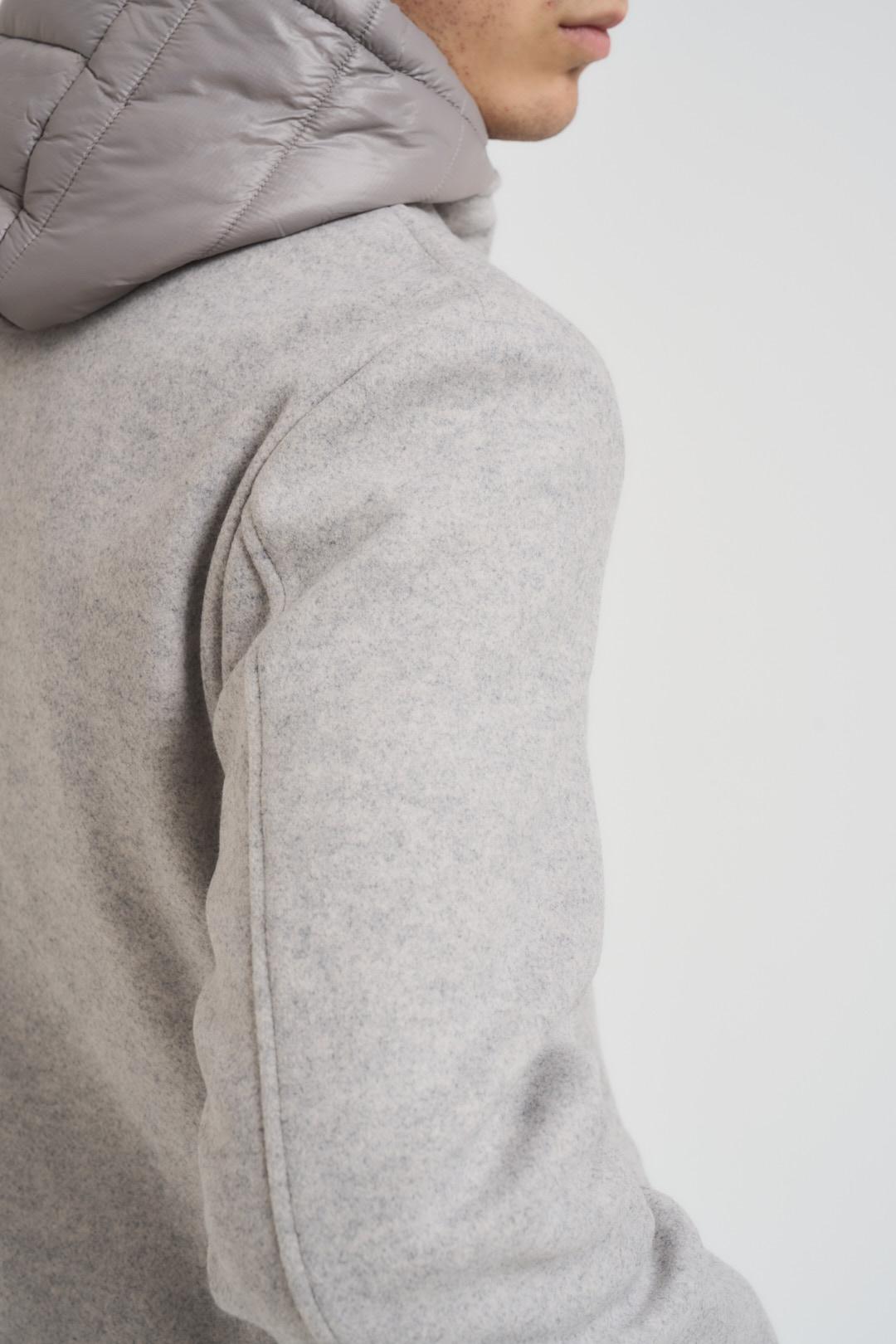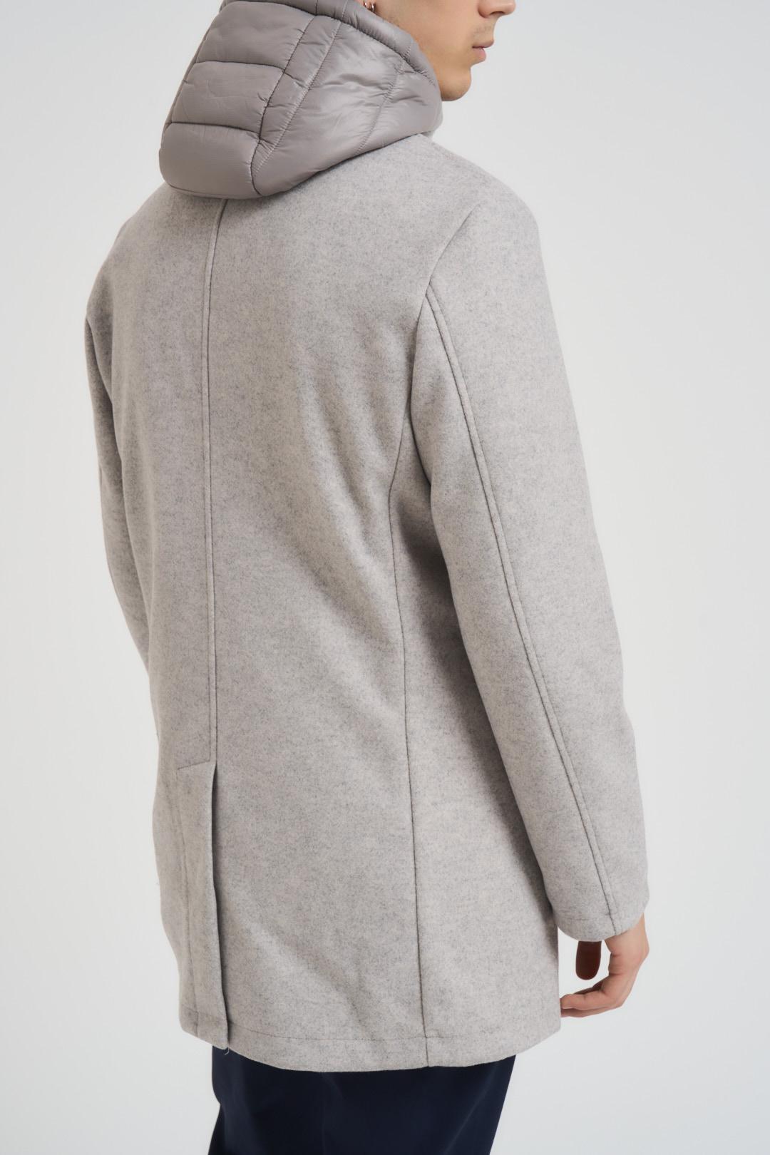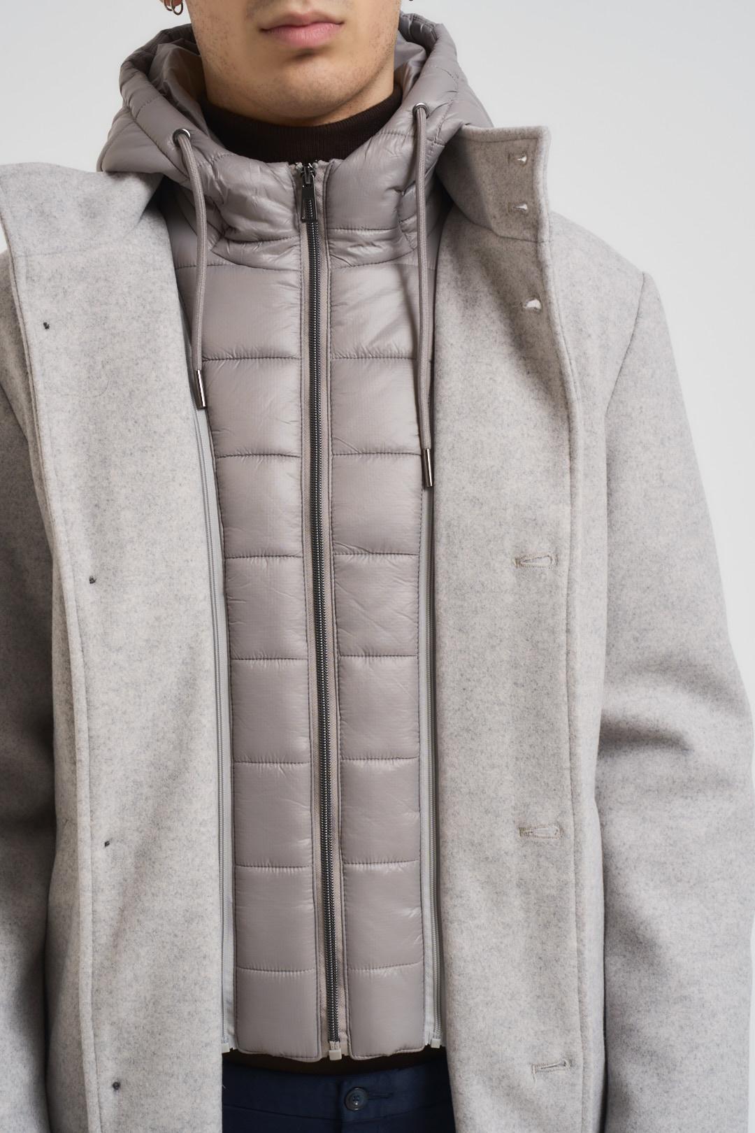 ADIMARI Cappotto uomo midi grigio chiaro con pettorina. Modello a trench con chiusura a bottoni e spacco sul retro centrale, pettorina trapuntata con cappuccio removibile da zip. Composizione: 100% poliammide. Il modello è alto 190cm e indossa la taglia L.