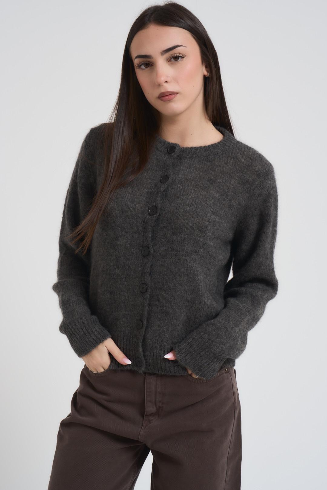 VICOLO Cardigan donna girocollo antracite. Modello con chiusura a bottoncini, dettagli a costine. Regular fit. Composizione: 34% alpaca 34% lana 32% polammide. La modella è alta 172 cm e indossa la taglia unica.