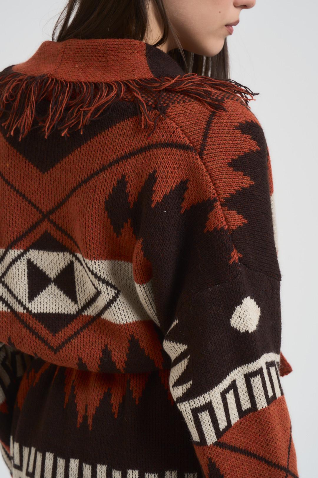 KIKISIX Cardigan donna in maglia multicolor. Modello marrone e arancione sfrangiato, cintura in vita. Composizione: acrilico e poliestere. La modella è alta 172cm e indossa la taglia unica.